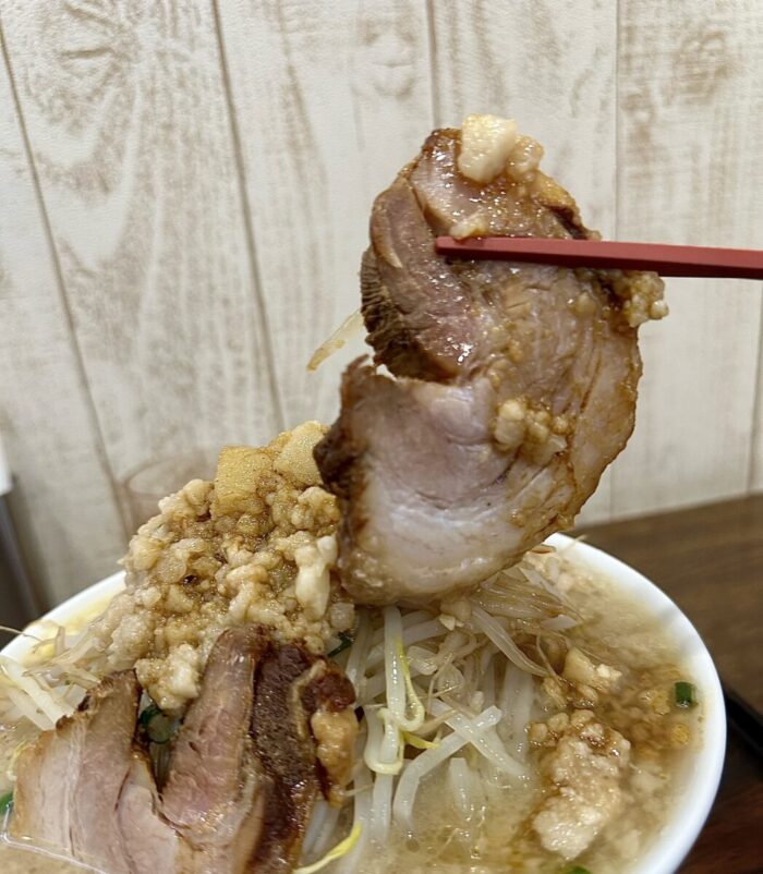 チャーシューはちゃんとしたしっかりブタ、厚みしっかりサイズもバッチリでこの時点でハイボ分類[二郎風]以上は確定