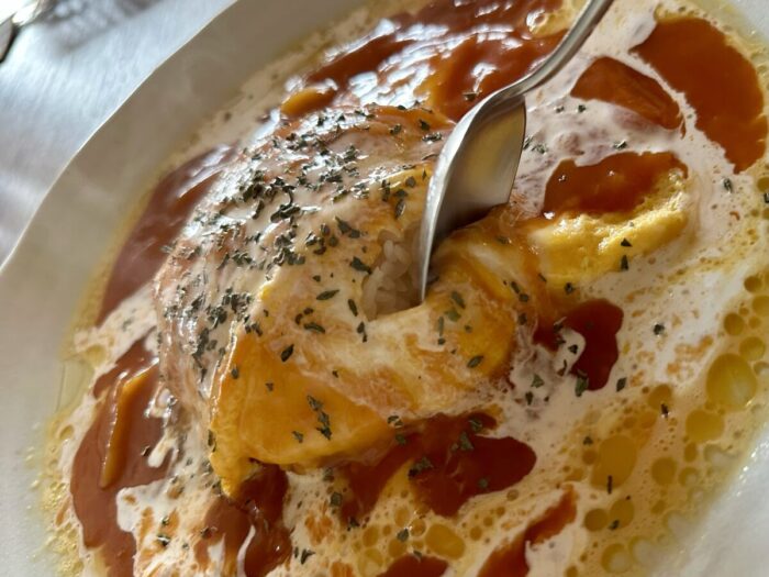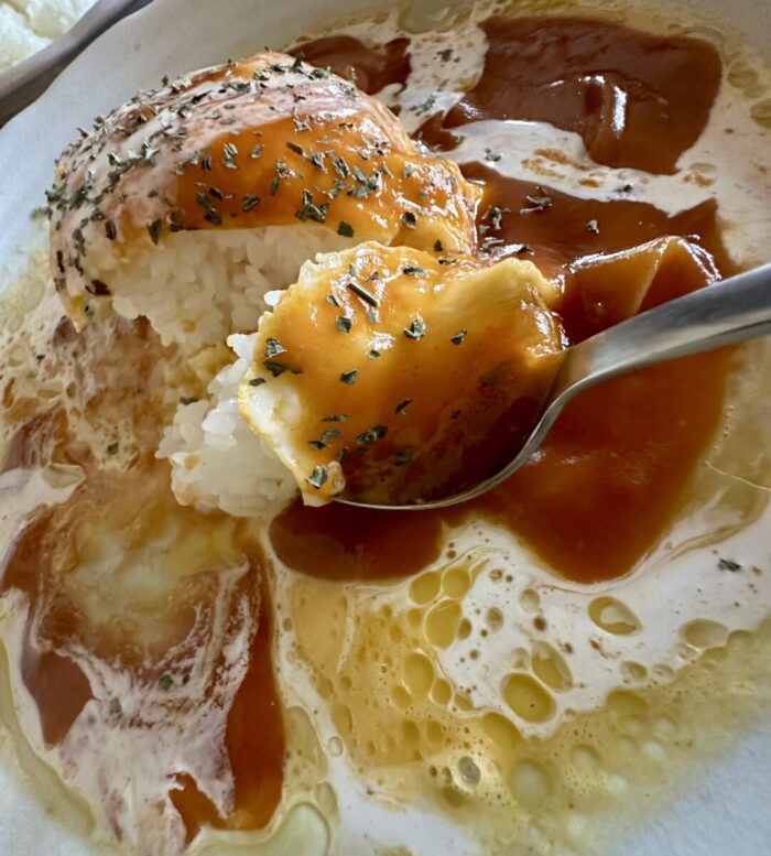 とろとろオムライスの汁ダク仕様、もちろん自分チじゃ絶対に出てこない圧倒的バエ感