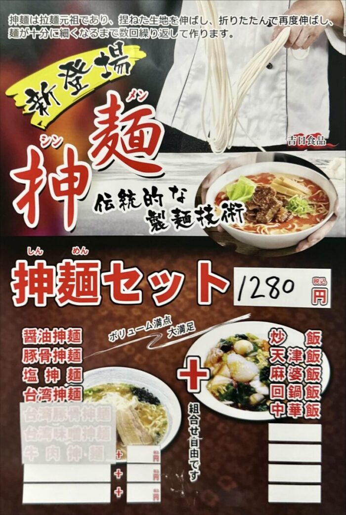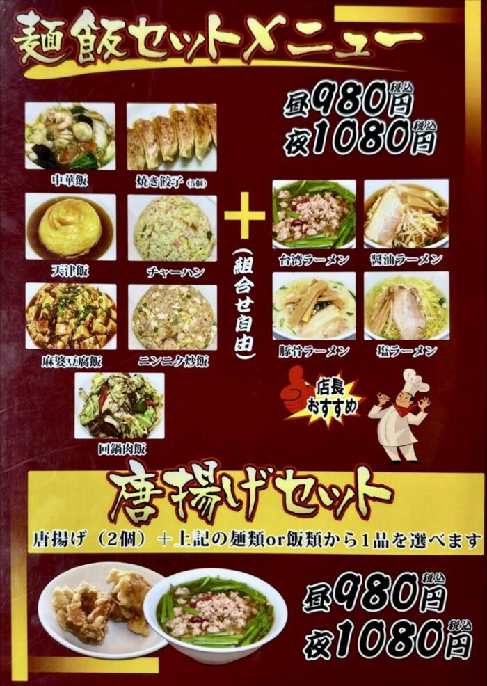 「麺飯セット」で選べる麺類は「台湾ラーメン」「醤油ラーメン」「豚骨ラーメン」「塩ラーメン」の4種類