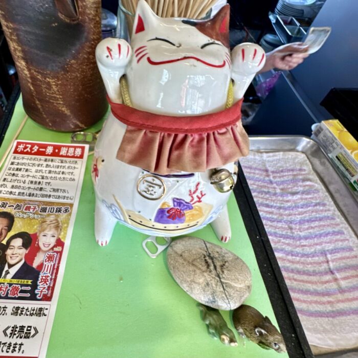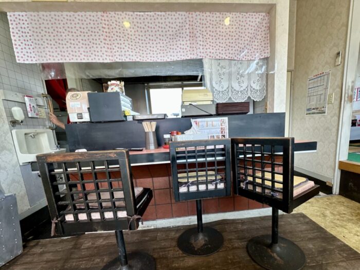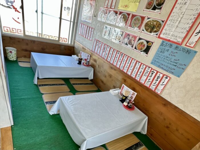さらに年季こもった小上がりテーブルも4人掛け×2卓、だからカウンター3+テーブル4+小上がり4の4=あのそのえーっとえっと(;´∀`)