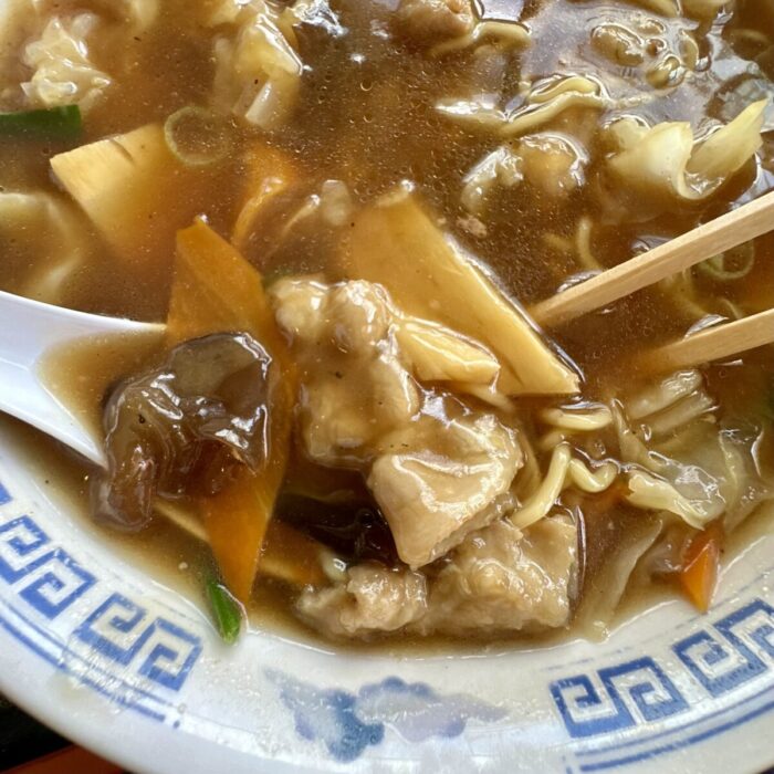 鶏ガラ中華なスープを基に、肉やら野菜やらを絡めた餡をドン、みんな大好き餡をドン!。