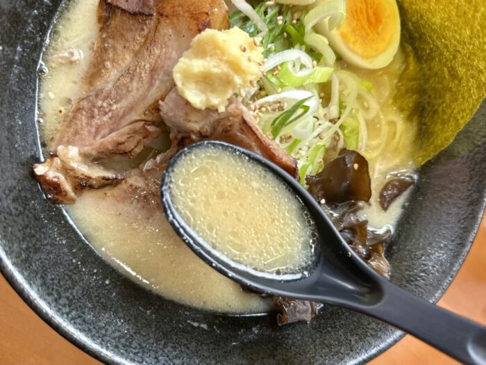 ショウガを溶かし込んで味変第一発目、元々まろやかだったスープのさらにカド取れたぐらいのまろやかに(´⊙◞⊱◟⊙`)