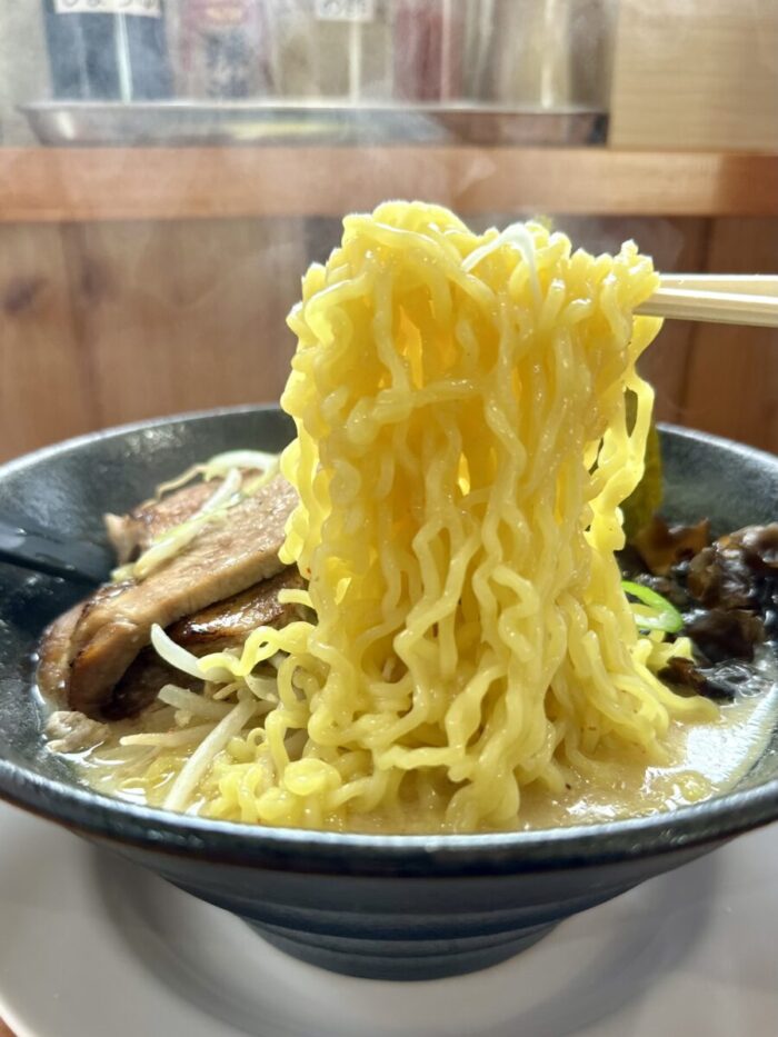 基本はこの細ちぢれ麺で、+50円で中太ちぢれ麺に変更可能という味噌、頼んだ後にそれ気付いてアフターカーニバル(´◔ ڼ ◔`;)