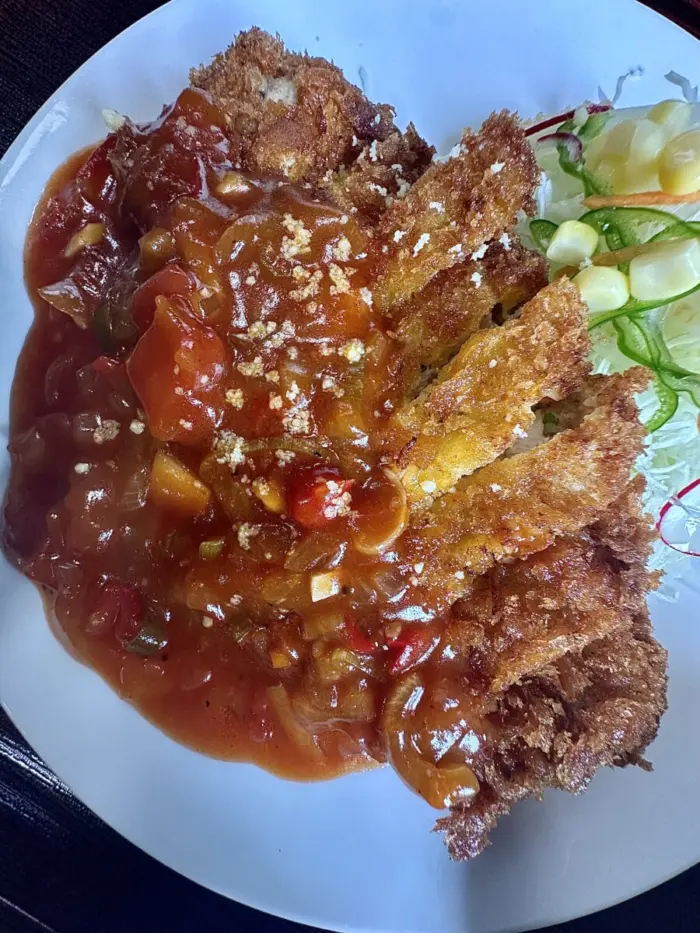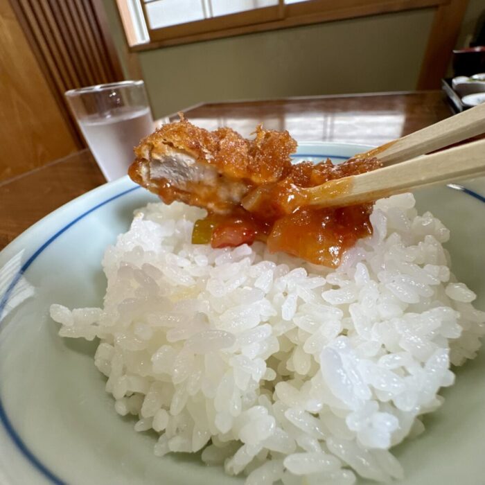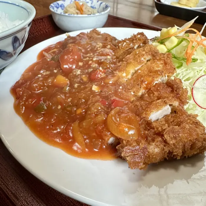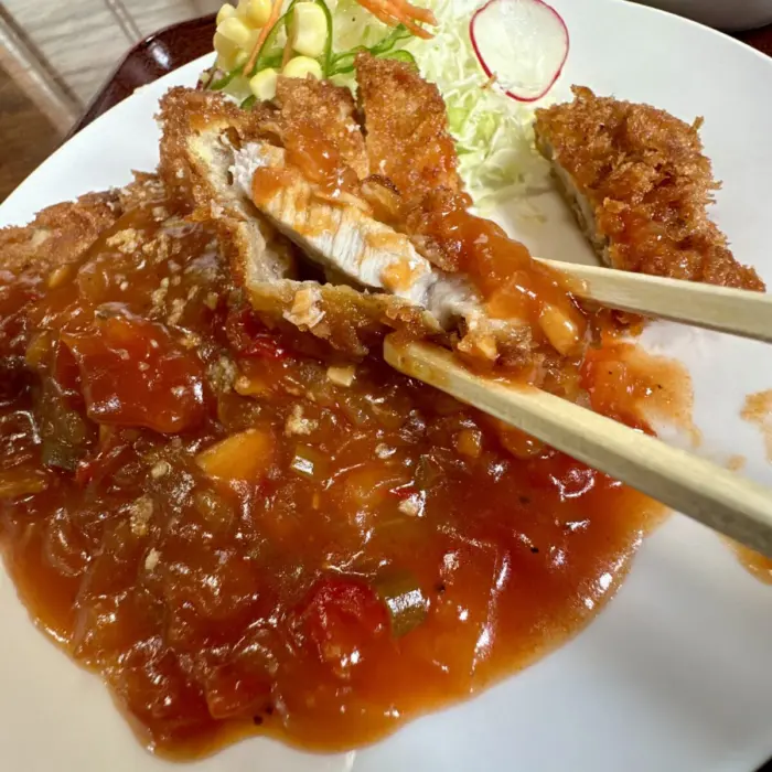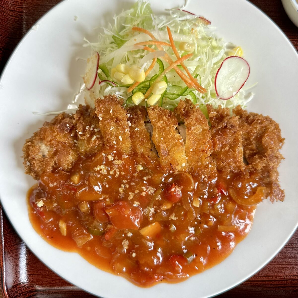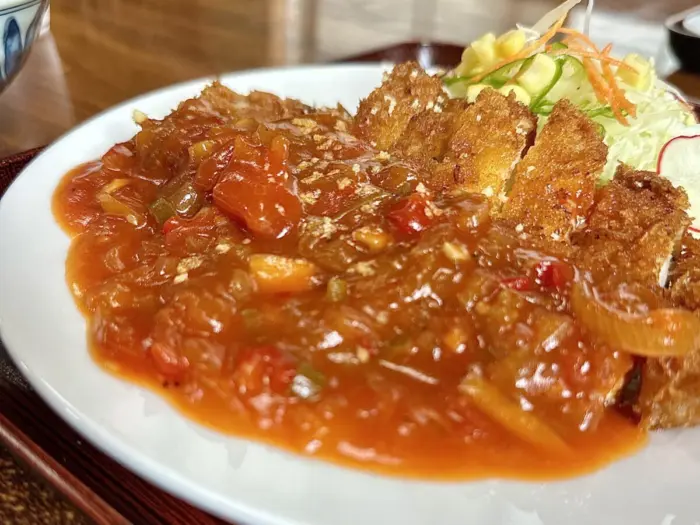 やがて大判カツにトマトソース掛け、アイキャッチーすぎる一皿が目の前に。