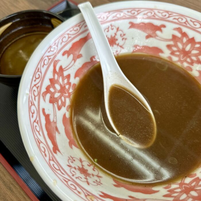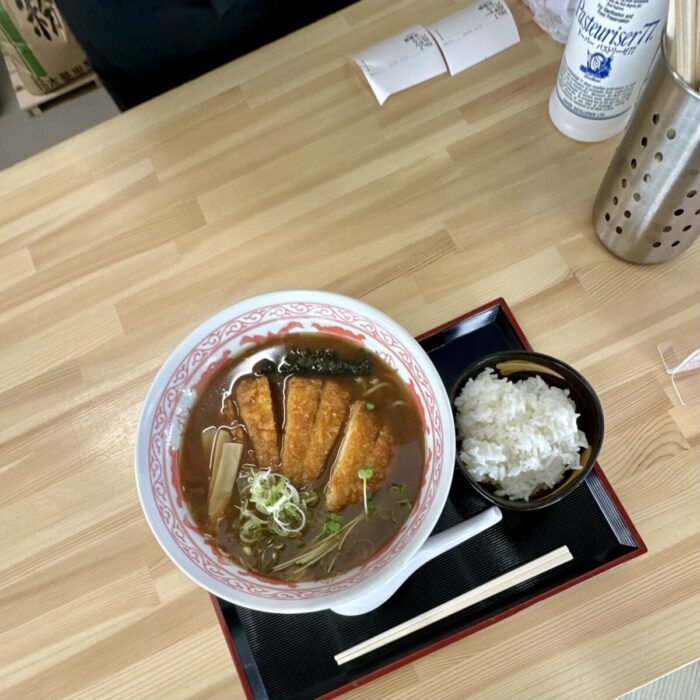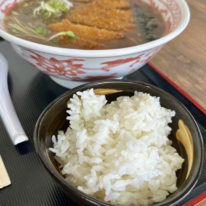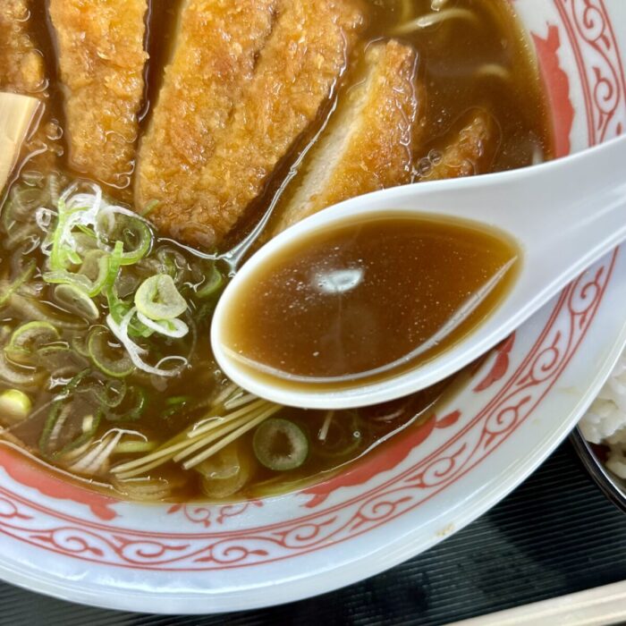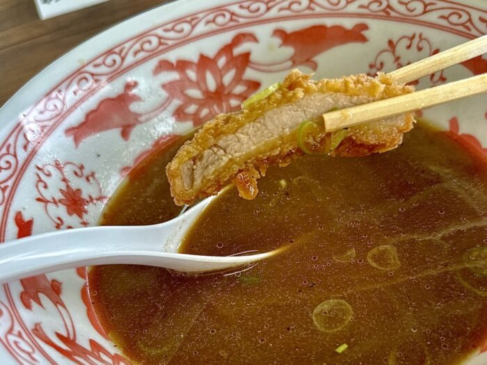 そこにラーメン側からびしゃびしゃに浸ったカツを一枚二枚と移し乗せ、そしてライス側に衣と汁の余韻を残しつつ、喰う。