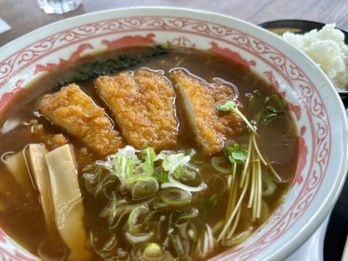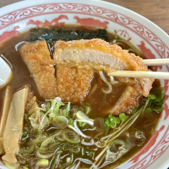 甘ジョッパ系のしっかり煮干しなスープに多加水中太ストレート麺、そして何より目を引くトンカツ一枚。