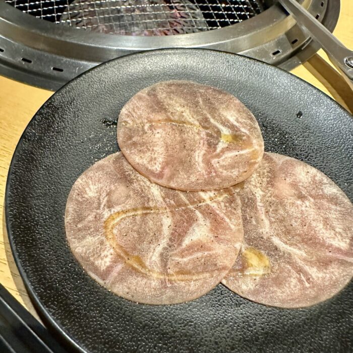 最初の一品として勧められる「きんぐ塩タン」、以前は一皿5〜6枚だったのが今じゃ半減の3枚っていうこんな時代に誰がした