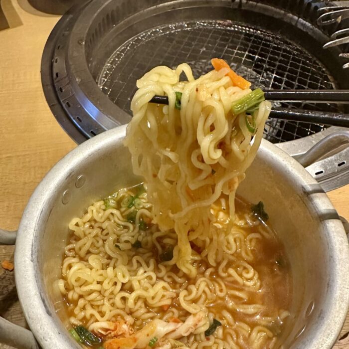 いいだけ喰っても残り時間あるならまだ喰える、ホイド根性丸出しの〆に「辛ラーメン(キムチ)」