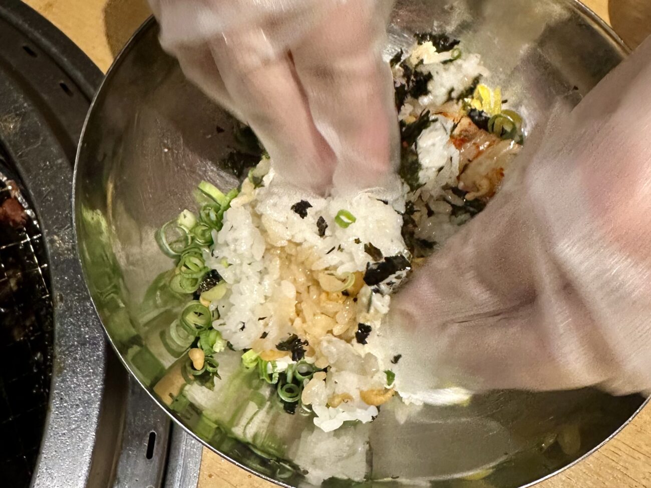 それはなんと手袋はいてセルフで丸めて喰うっていう、手間も2倍ならエンタメ性もニバイニバーイとかっていう(´◔ ڼ ◔`)