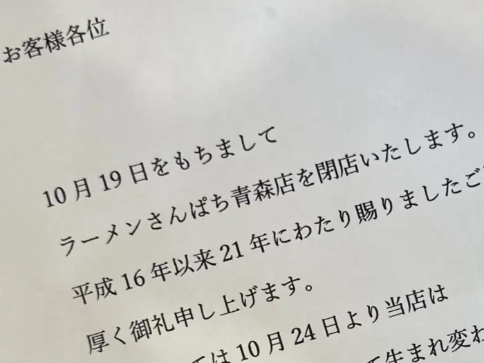 明日19日をもって、21年にもわたる営業に終止符打たれる【ラーメンさんぱち 青森店】。