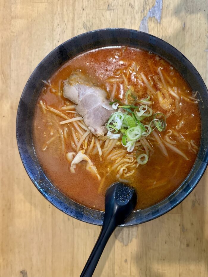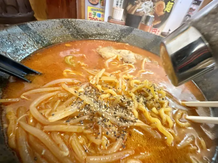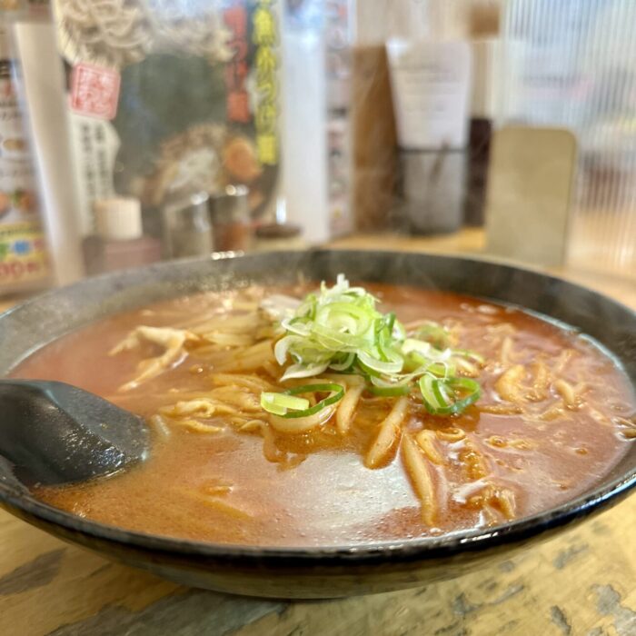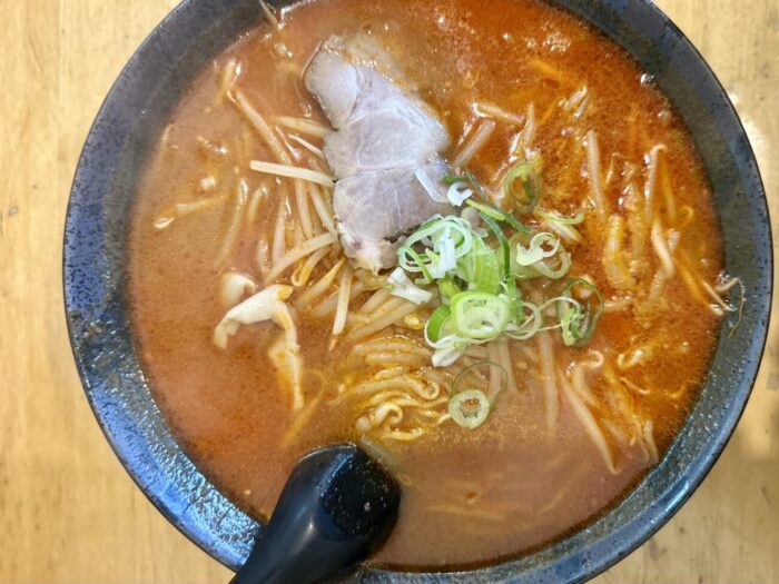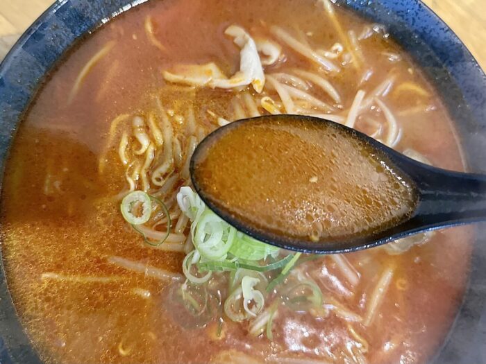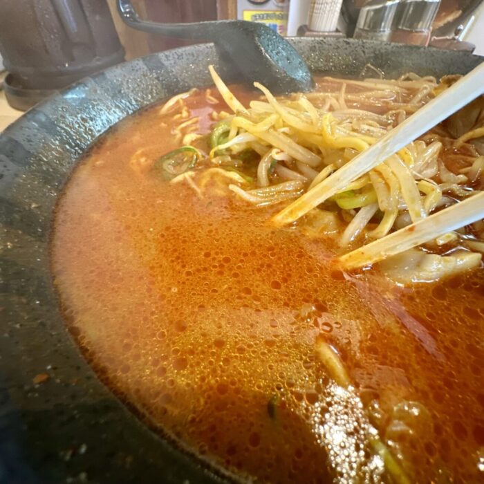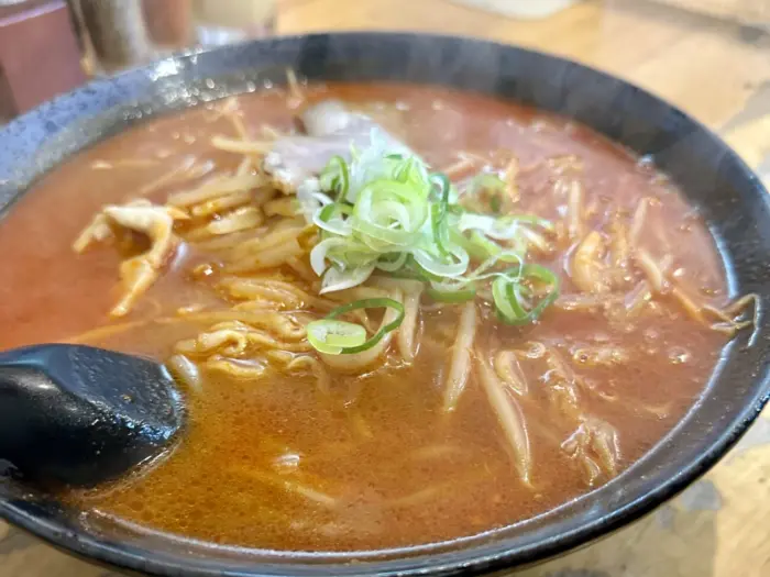 ここでムセようものなら最後までムセ続けることなる緊張の一口目、軽めの味噌の香ばしさからドシッと響く辛さのスープ、無事クリア