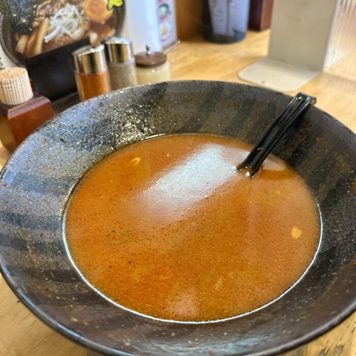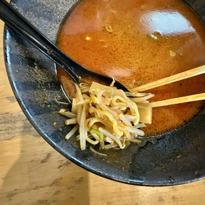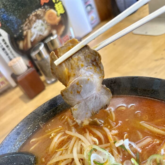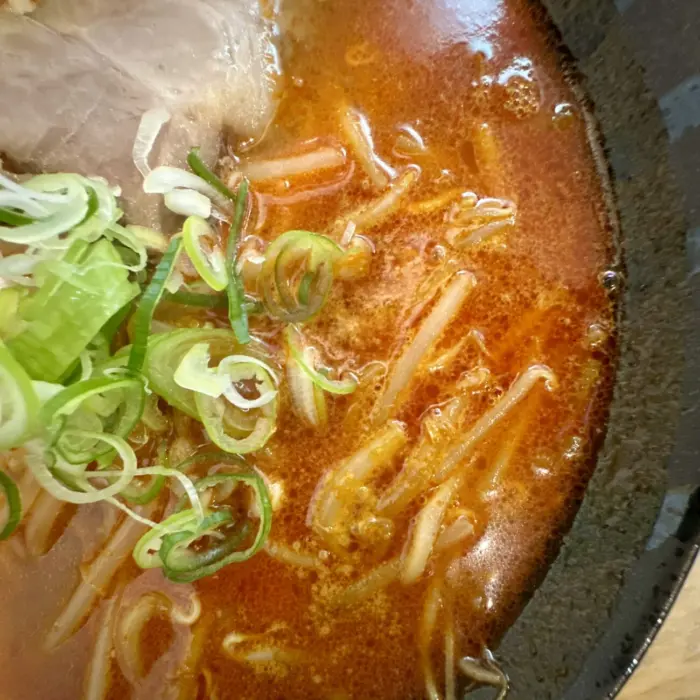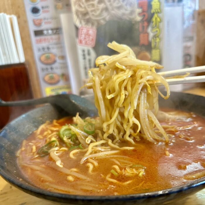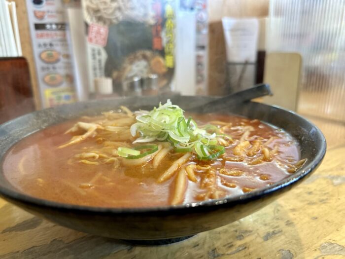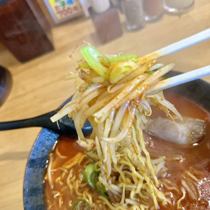 ここでムセようものなら最後までムセ続けることなる緊張の一口目、軽めの味噌の香ばしさからドシッと響く辛さのスープ、無事クリア