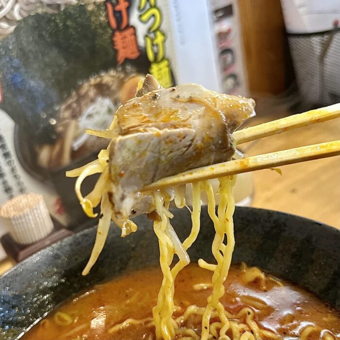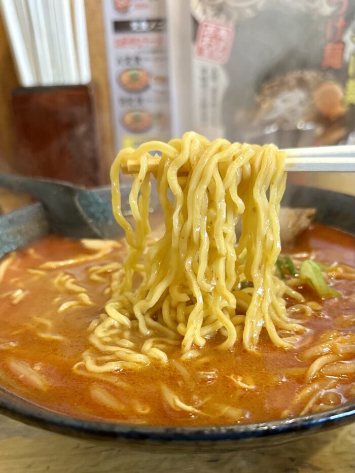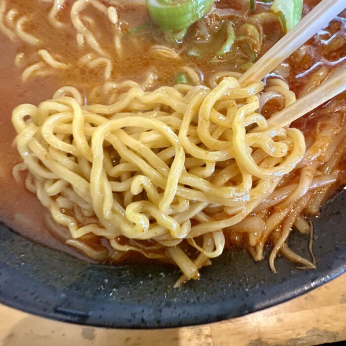 デストロイなスープの強さにも引けを取らない、麺そのものの旨さが光る麺はさすが北海道にフランチャイズ本店をおく「さんぱち」ならでは(´◔ ڼ ◔`)