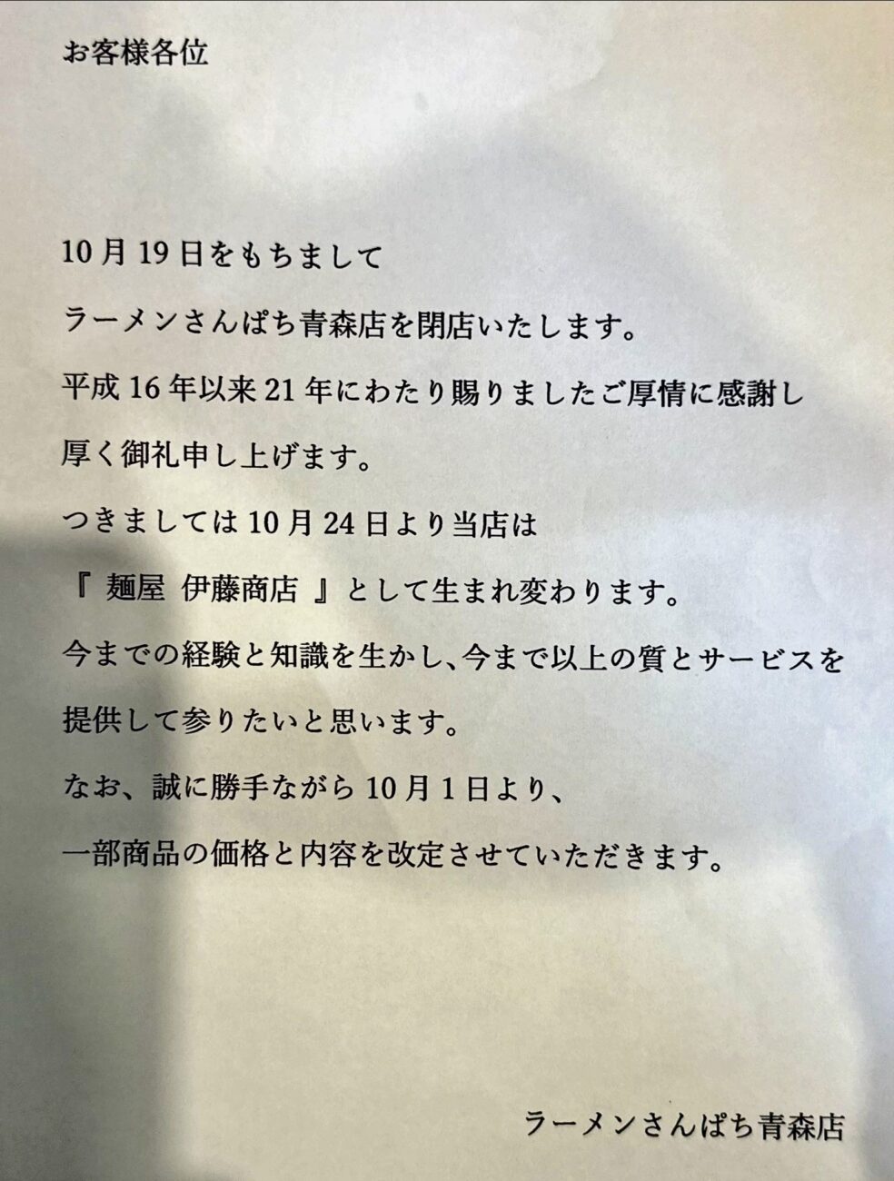 明日19日をもって、21年にもわたる営業に終止符打たれる【ラーメンさんぱち 青森店】。