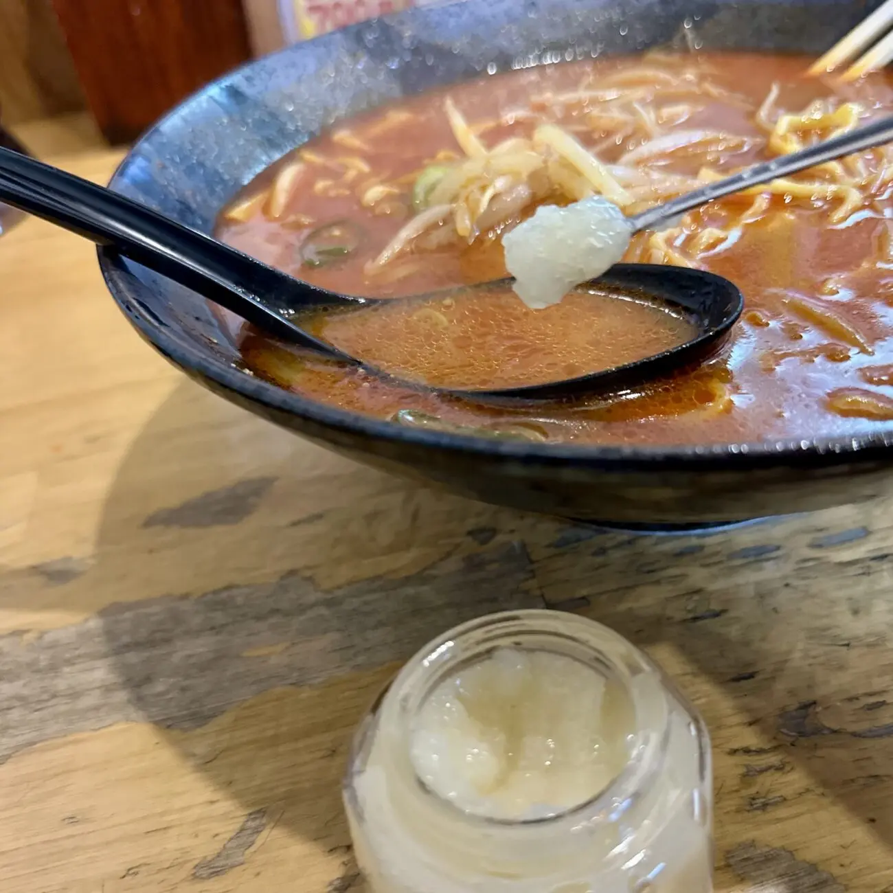 ここでムセようものなら最後までムセ続けることなる緊張の一口目、軽めの味噌の香ばしさからドシッと響く辛さのスープ、無事クリア