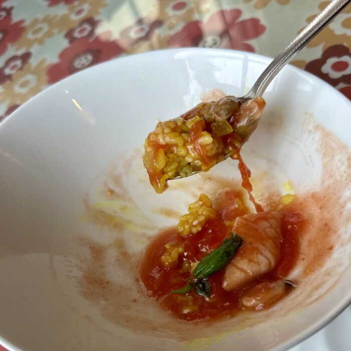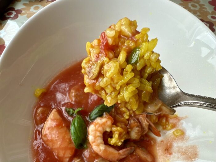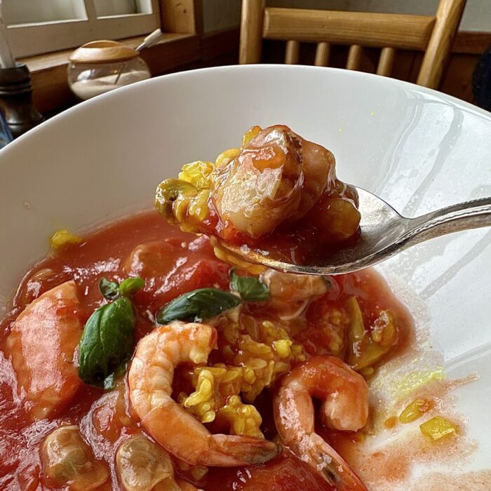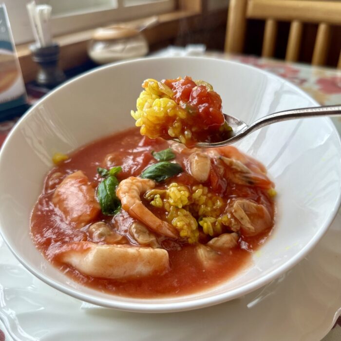 黄色いご飯にドバッとかかるトマトソース仕込みの海鮮ゴロゴロ。