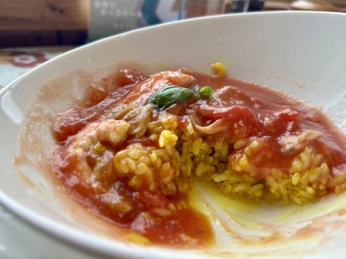 アッサリサッパリとしたトマトソースとオリーブオイルの香り、そこに黄色いピラフが合わさって、しかも普段喰わない補正もあってコレ、とっても美味いっす