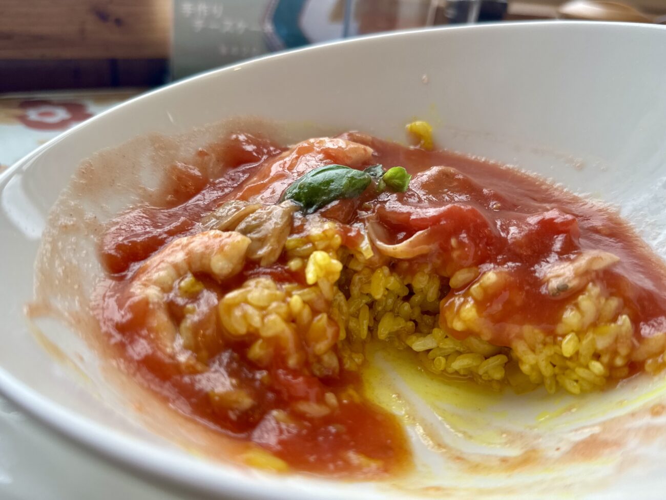 黄色いご飯にドバッとかかるトマトソース仕込みの海鮮ゴロゴロ。