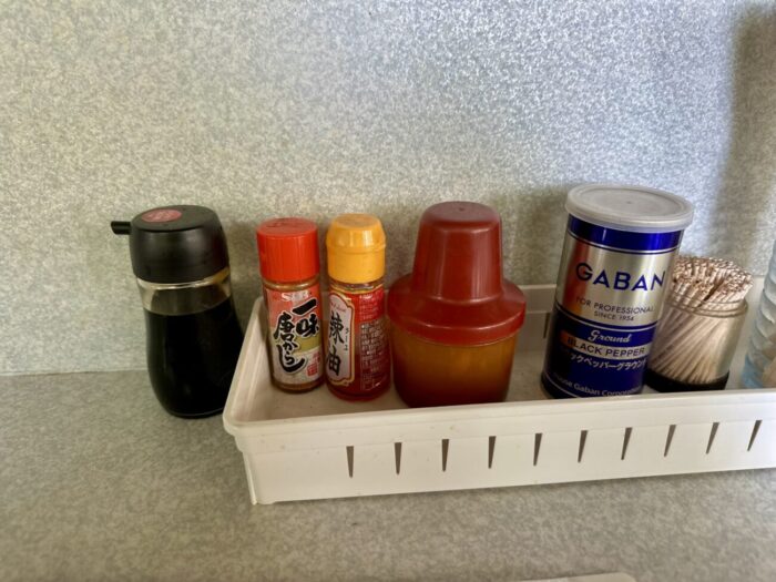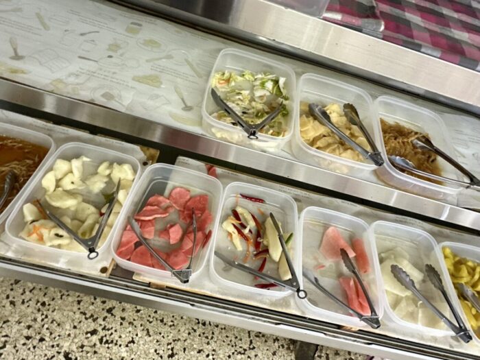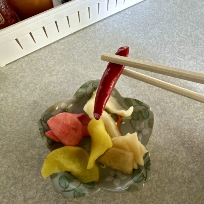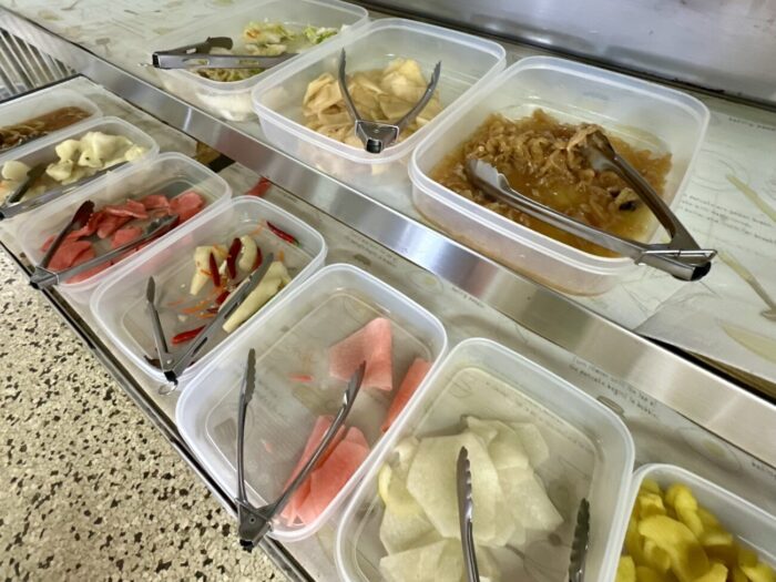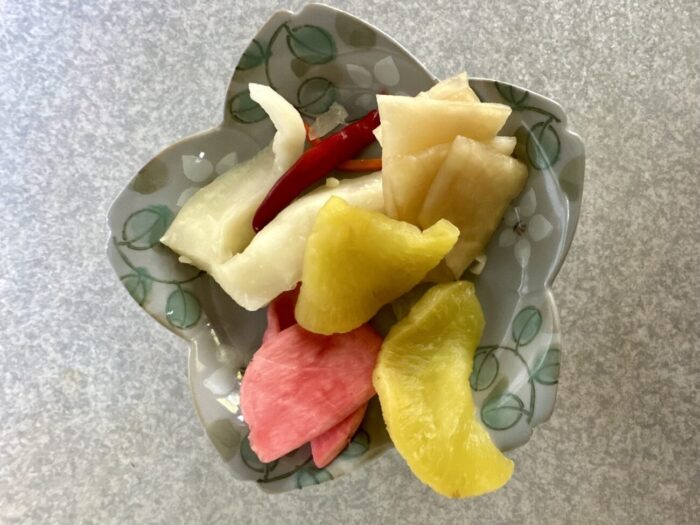 麺類注文者に限り、何種類もある漬物がなんと食べ放題、つまりあとライス頼めば麺・オシ・コメの大三元。