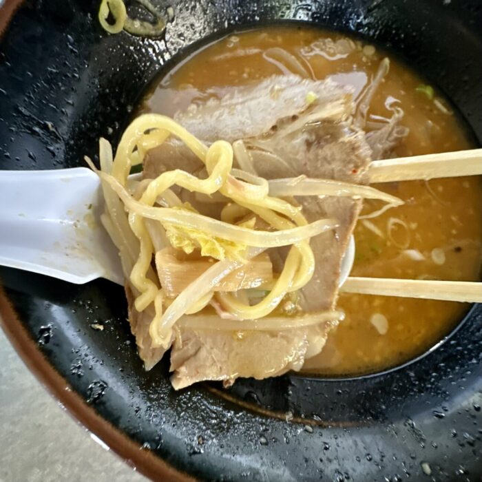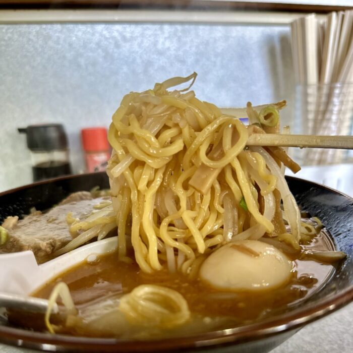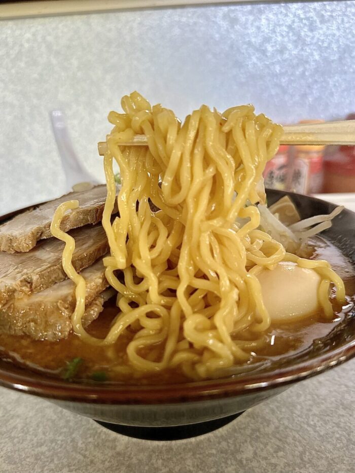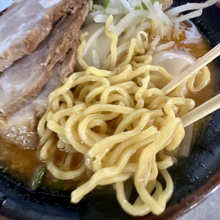 麺はもちろん熊さん麺、もちもち中太のちぢれタイプがまろやかスープとビダッとマッチ