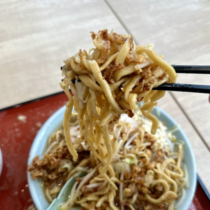 特筆すべきはその麺、今回の出店に合わせ特注したという切刃のおかげか配合か、モチでゴワでガッシゴシでとても良き。