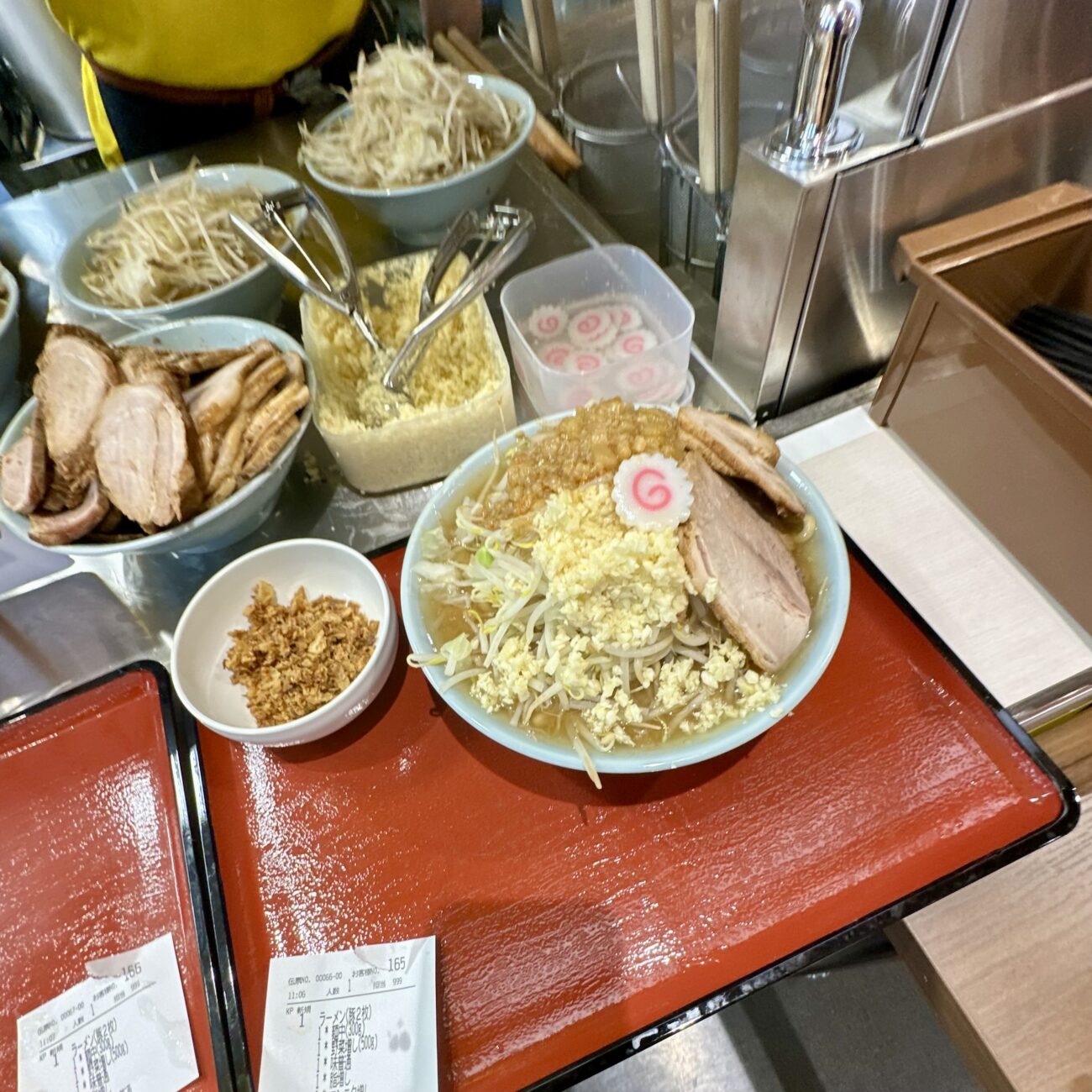 現金のみ対応のフルタッチ券売機、オーダーしたのは【ラーメン中・全部マシフライドオニオン】税込1,200円。