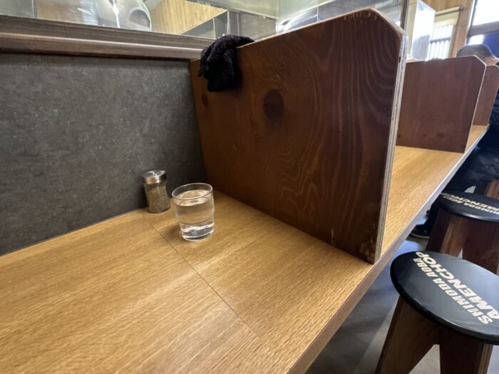 ありがたいのは横席客の目線も気にならないパーティション、そしてどう読んでもラーメンチョプなイス