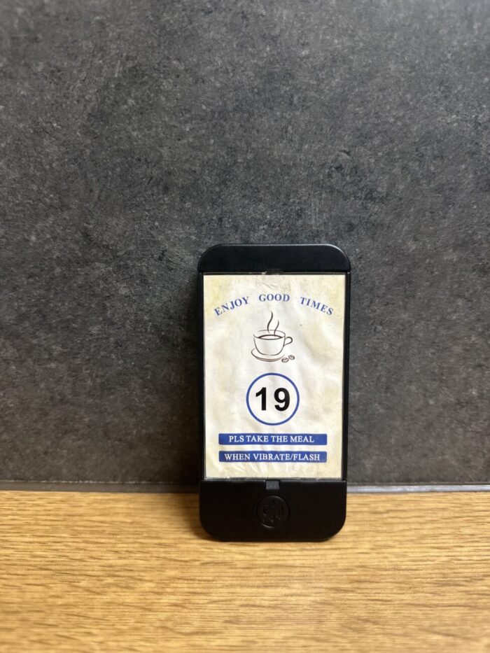 ベル受け取ったらお好きなイスでただ待機、なんなら好みのイス空いた時点で移動したって全然いい