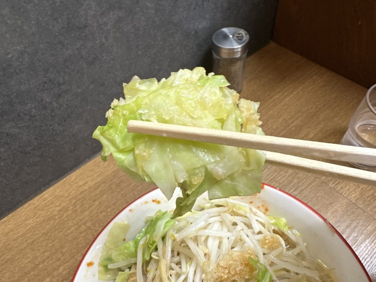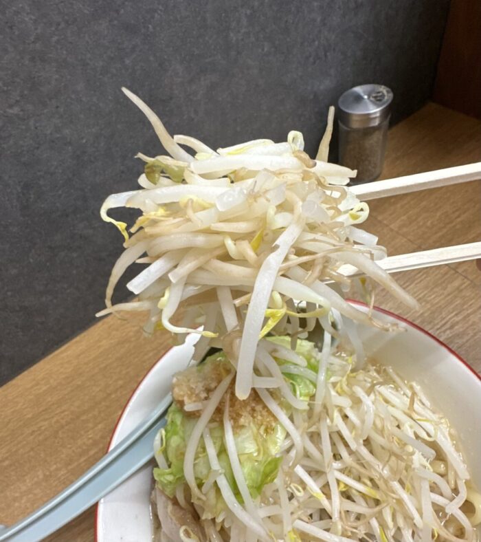 麺茹でテボで型付けられるマシ野菜はモヤシたっぷりキャベツもしっかり、丼上で美しいアールを描く。
