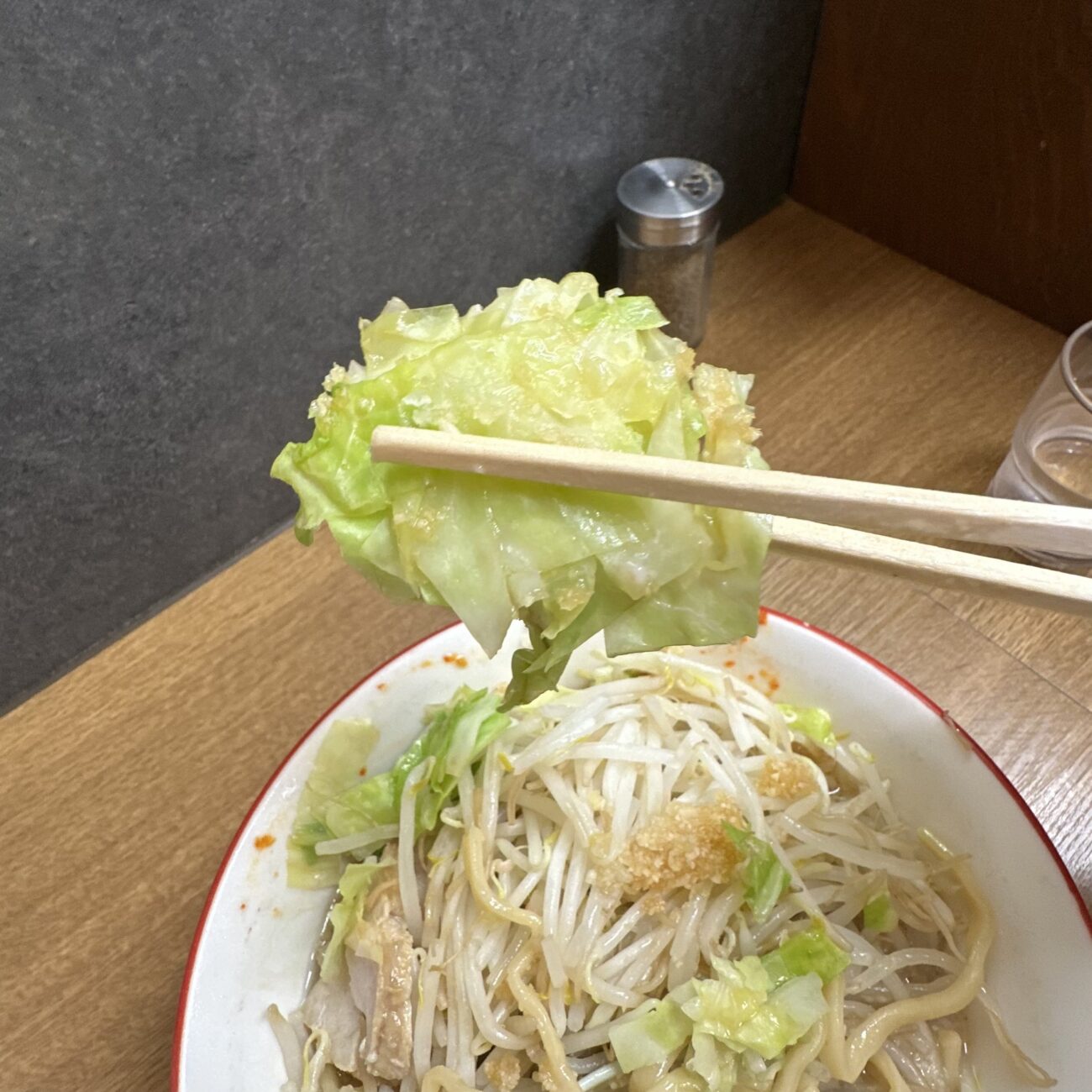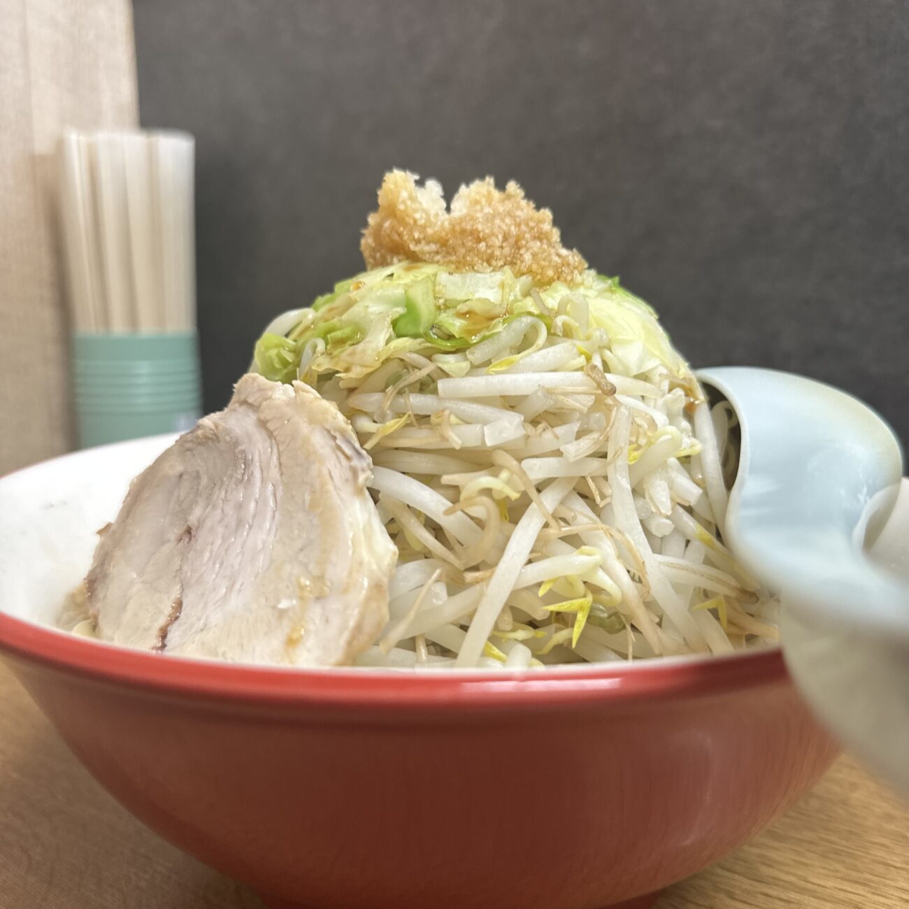 麺茹でテボで型付けられるマシ野菜はモヤシたっぷりキャベツもしっかり、丼上で美しいアールを描く。