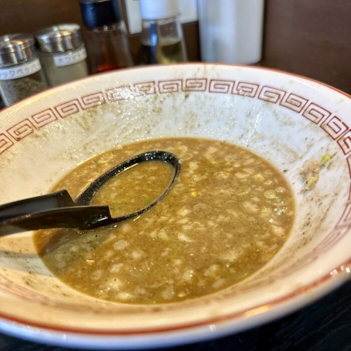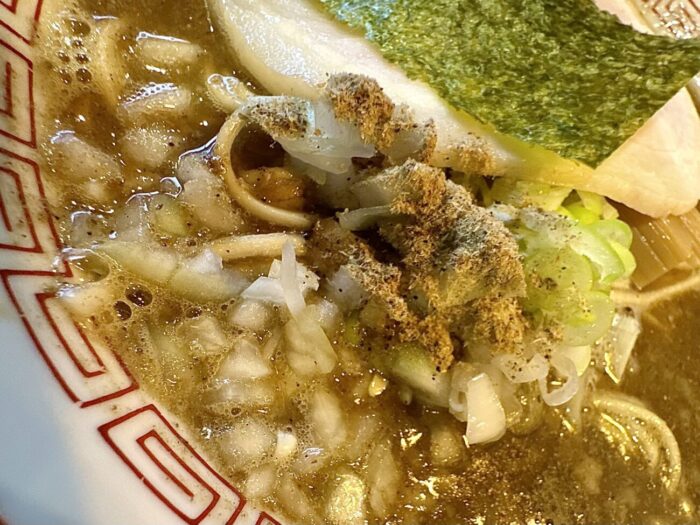 見るからにドプッ濃いスープには清涼感溢れるザクタマがよく似合い、それを台無しにしようとする魚粉もまた似合う