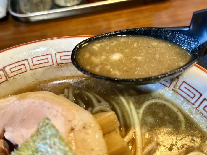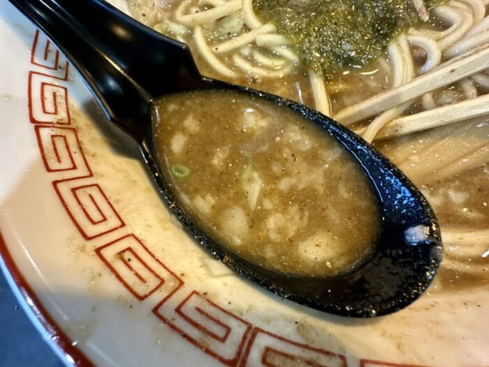 ドロ気味のスープは一口でニボガマリに染まれる特濃品、溶かし込まれたセアブラと相まって非常にクリーミー。
