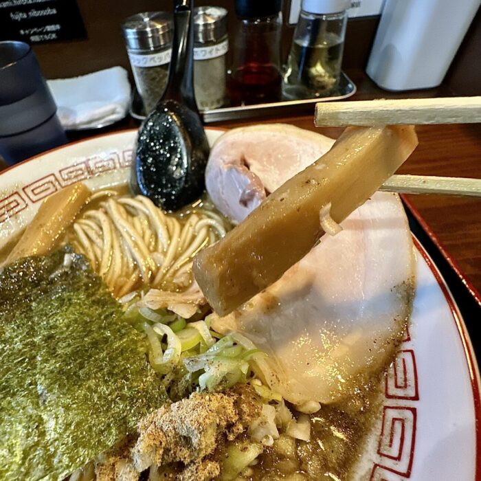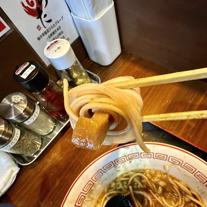 スープはカエシのショッパミに加えて煮干し本体がもってるショッパミで塩っけ強め