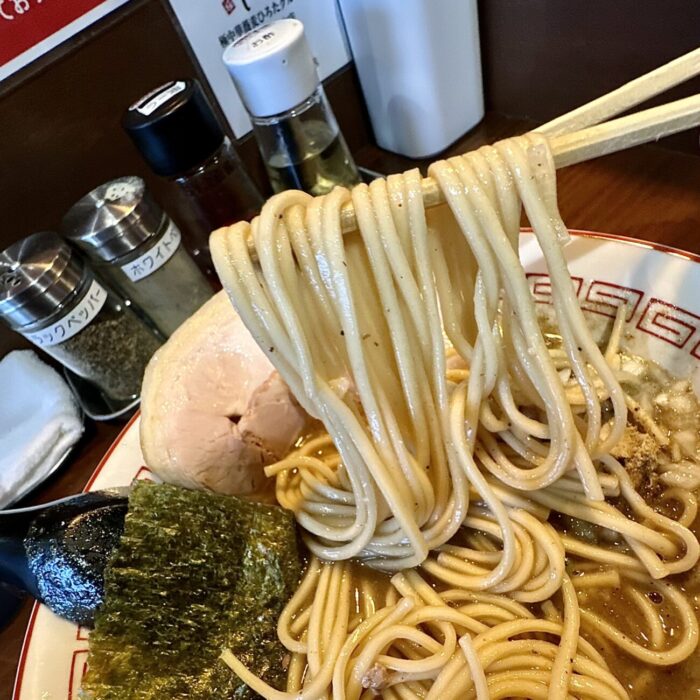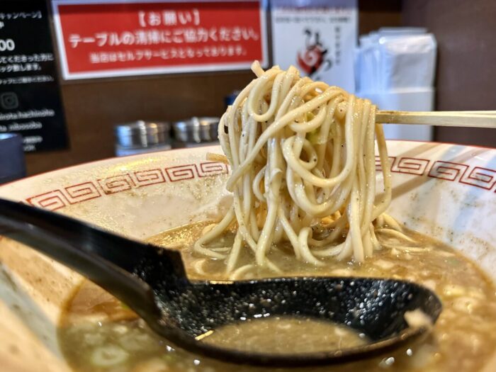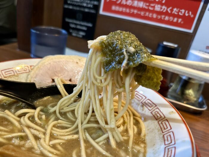 麺は低加水の細パツストレート、汁の強い塩っけを見事なまでに引き上げて口内粘膜を干からびさせる