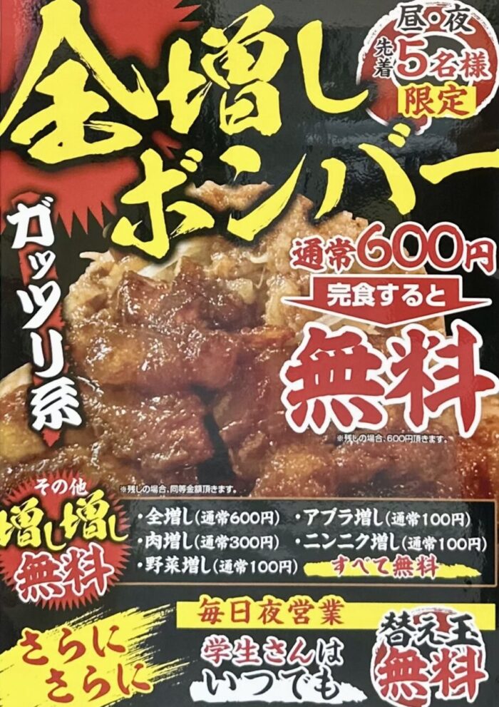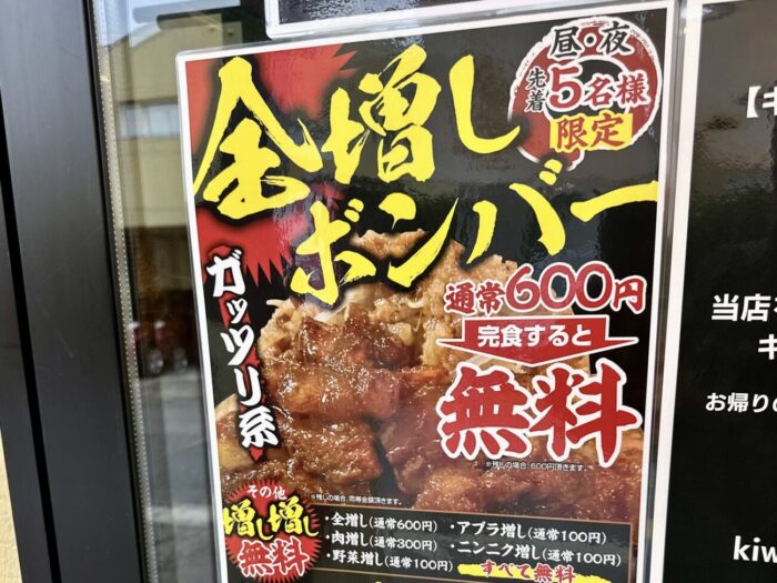 なんだばこのクレイジーな張り紙は、先着5名で増しトッピングが全無料とか狂ってるぅ♪( థ ౪థ)キャッ