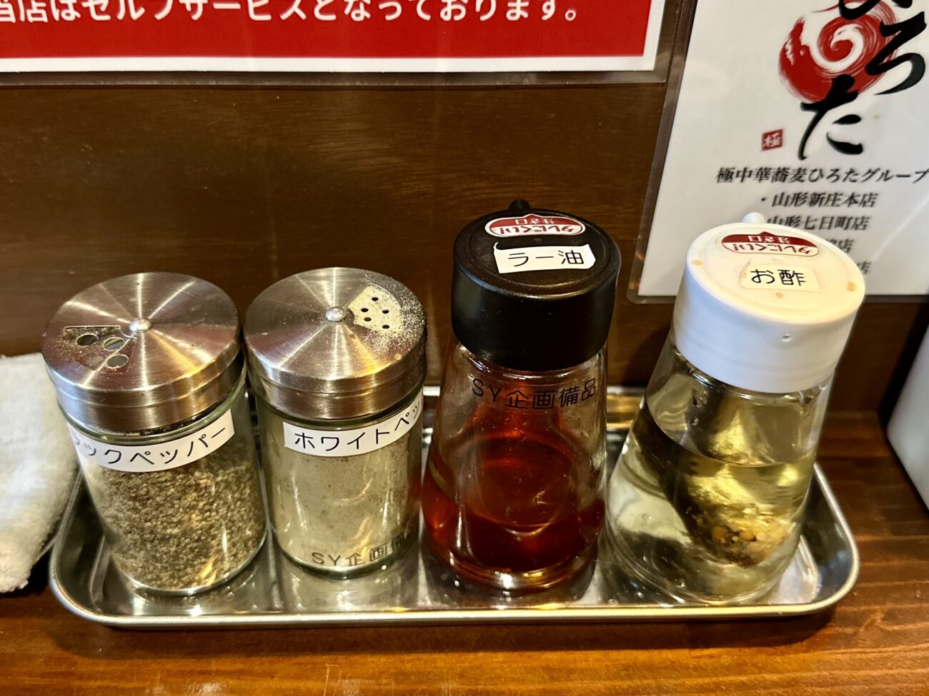 卓上の調味料としては次のとおり、黒、白、赤、酢、以上ッ!( ✧Д✧)