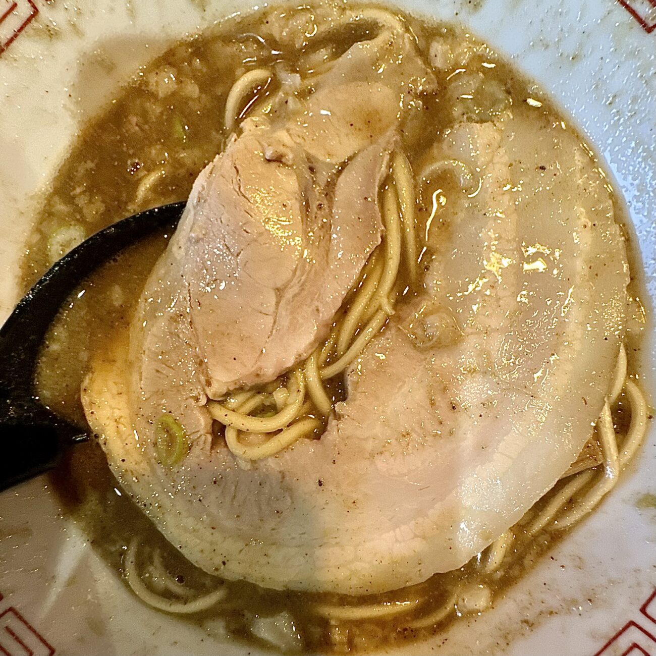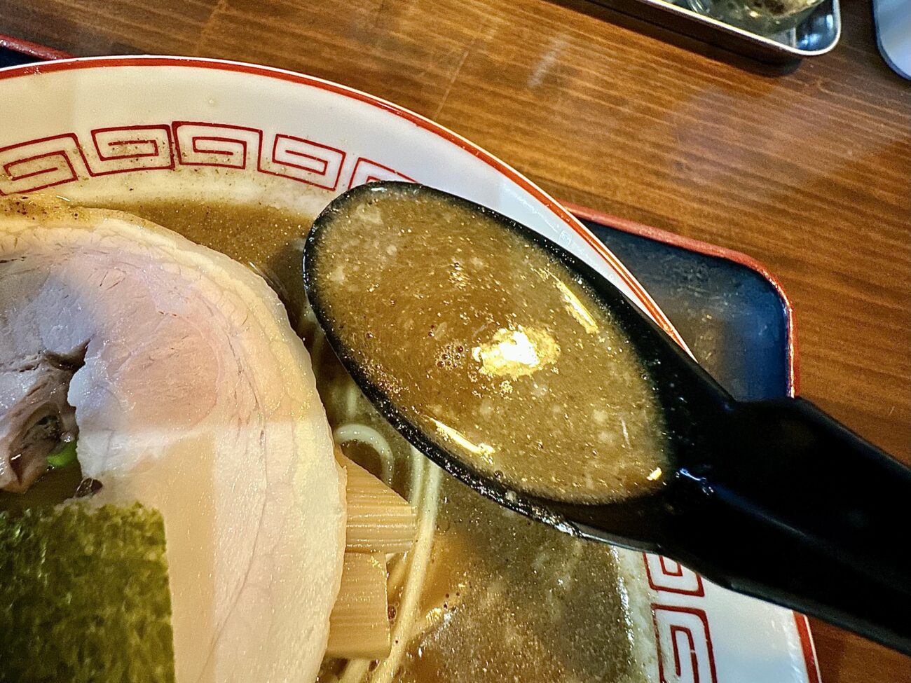 ドロ気味のスープは一口でニボガマリに染まれる特濃品、溶かし込まれたセアブラと相まって非常にクリーミー。