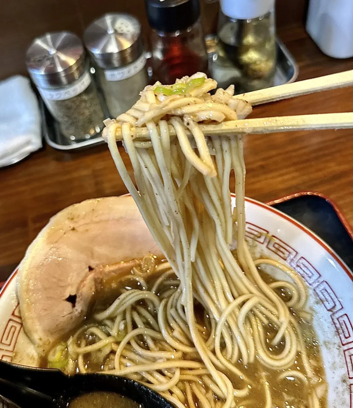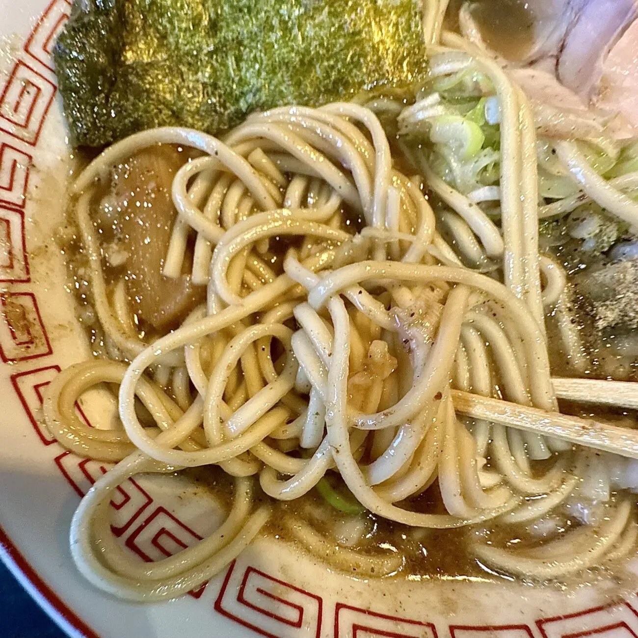 麺は低加水の細パツストレート、汁の強い塩っけを見事なまでに引き上げて口内粘膜を干からびさせる