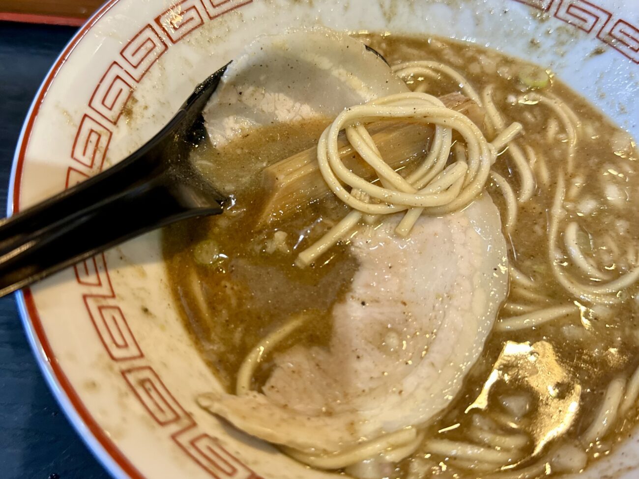 スープはカエシのショッパミに加えて煮干し本体がもってるショッパミで塩っけ強め