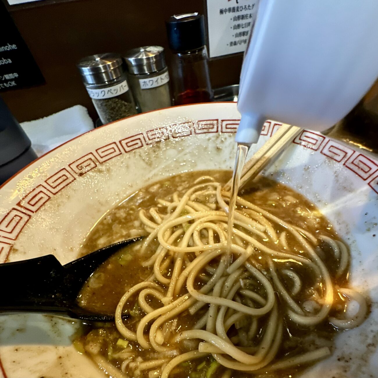 見るからにドプッ濃いスープには清涼感溢れるザクタマがよく似合い、それを台無しにしようとする魚粉もまた似合う