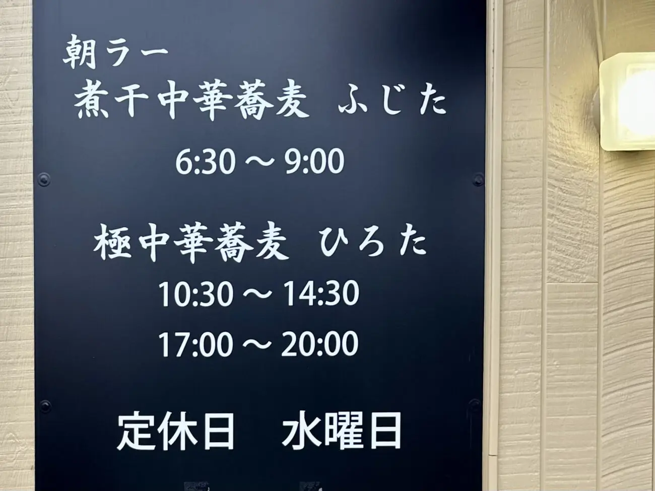 | 営業時間 | 6:30〜9:00(煮干中華蕎麦ふじた) 10:30〜14:30、17:00〜20:00(極中華蕎麦ひろた) |