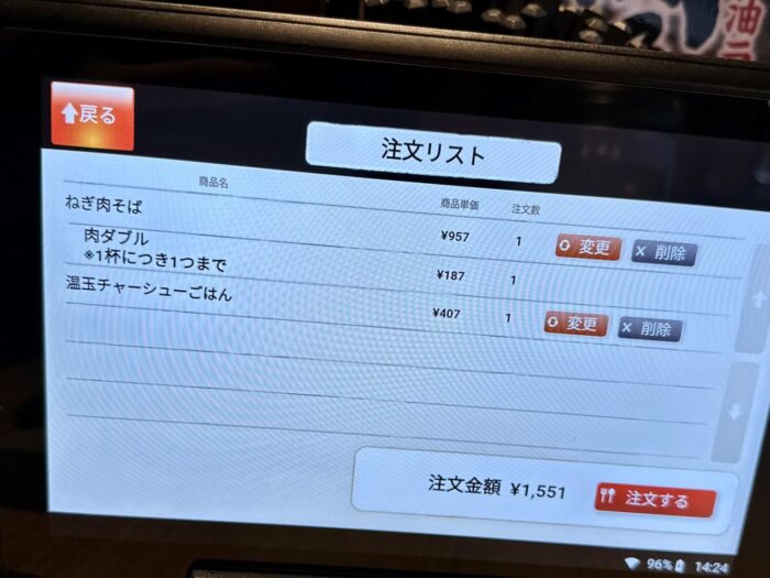 オーダーしたのはもちろん看板商品「肉そば」、しかもネギと肉にまみれる【ねぎ肉そば(肉ダブル)】税込1,144円。