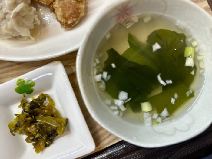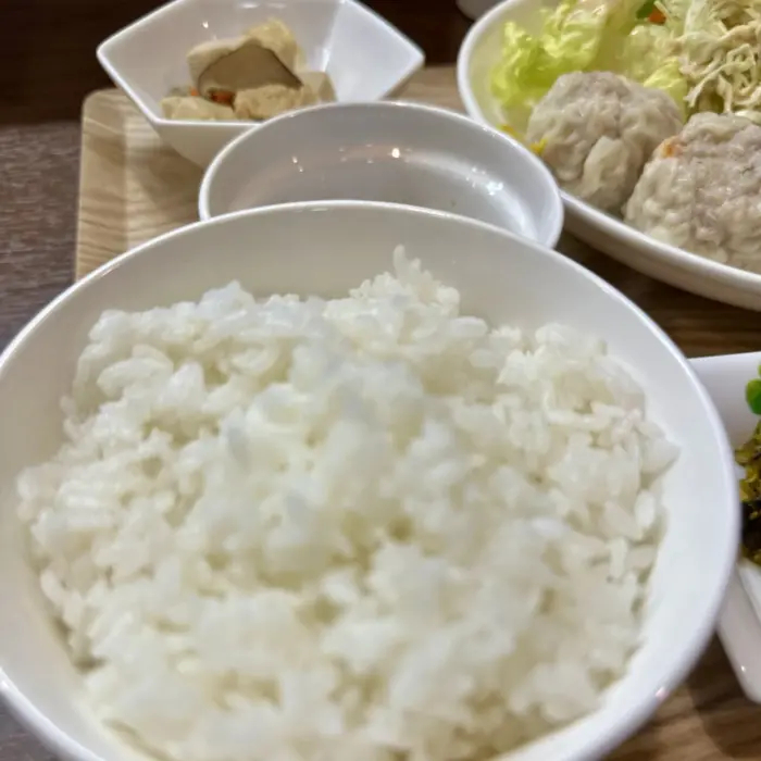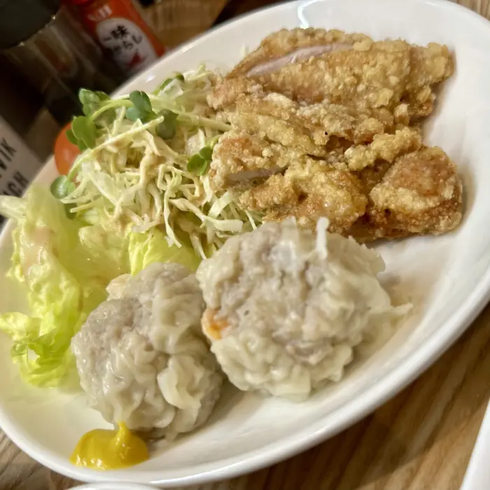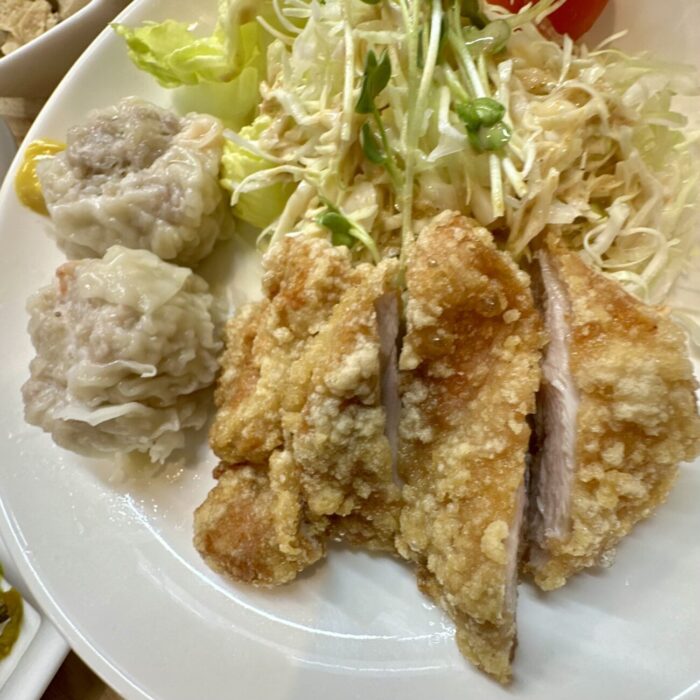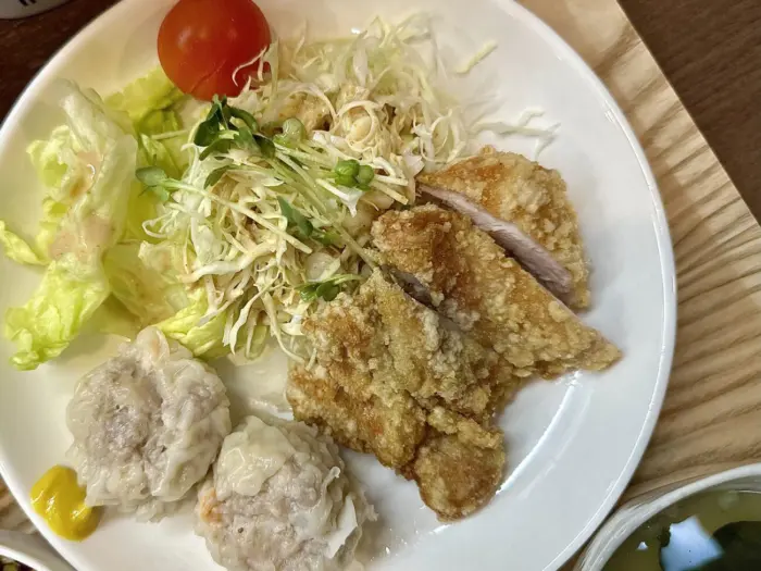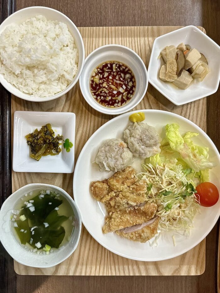 その某有名店仕込みのユーリンチーに、ブリンブリンのシューマイがセット、そして飯・汁・小鉢がセットになった満足セット。