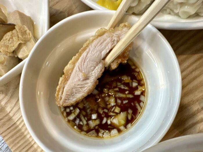 そんな下味ちゃんと付いてる油淋鶏だぉん、専用ダレにつけて喰ったらそりゃ足元だって自然に跳ねる