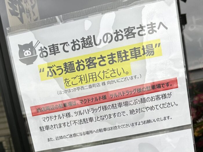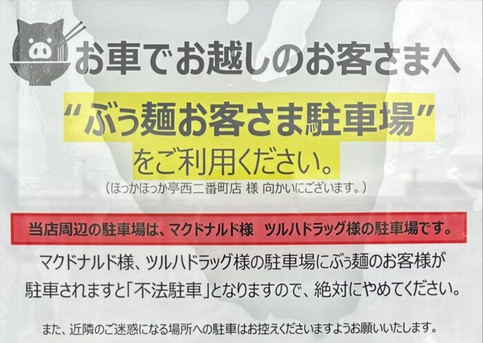 そんな新店「ぶぅ麺」の駐車場は徒歩2分の専用駐車場利用が大原則。