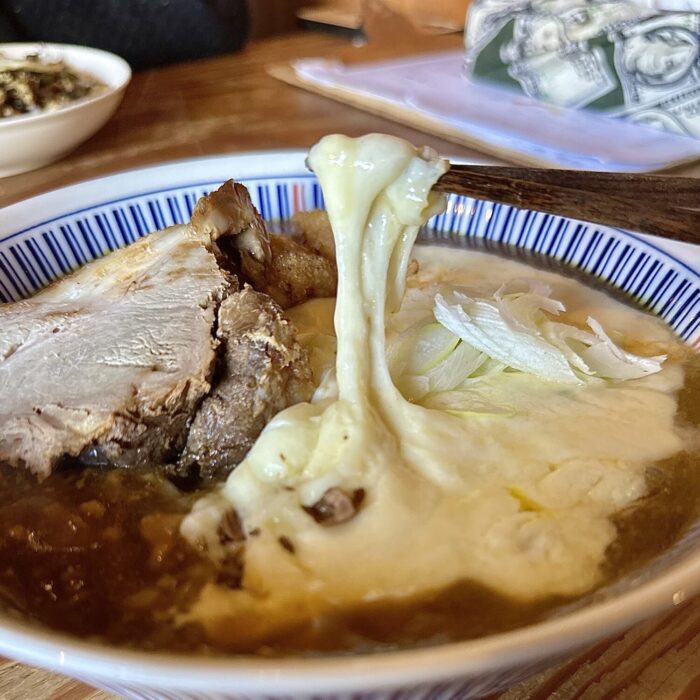 差したレンゲにまとわりつくほどのドロッドロの超高粘度、しかも専用トッピング「山盛りチーズ」によるドロドロマシマシ状態で、飲めば飲むほど強くなる、ような気がする旨さ。