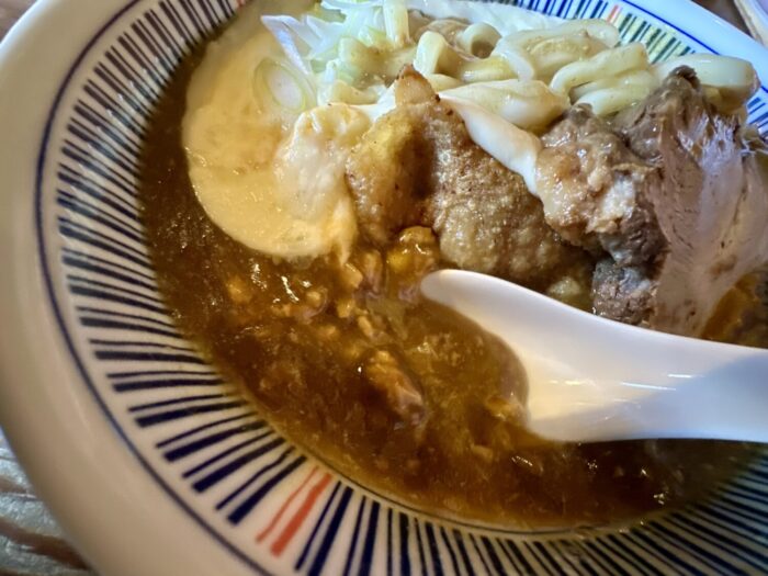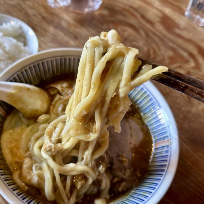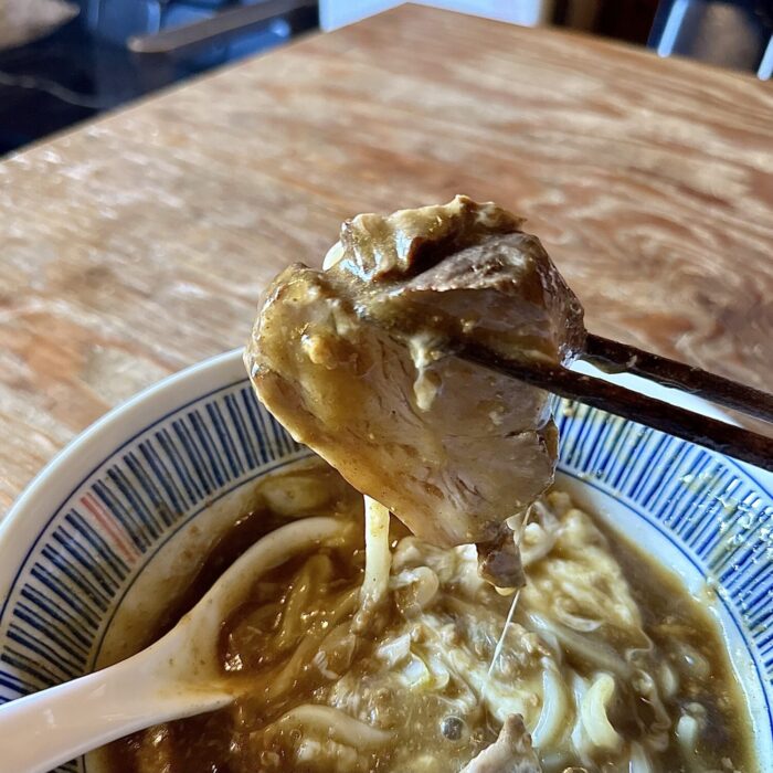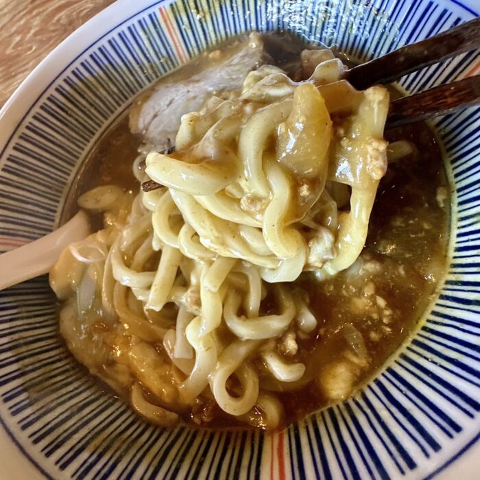 ムッチムチの歯触りのドゥルンドゥルンのタフな喉越し、まとわりついたカレー出汁とゴックンすればアヂッ、アヂヂヂヂッって焦るやづ。