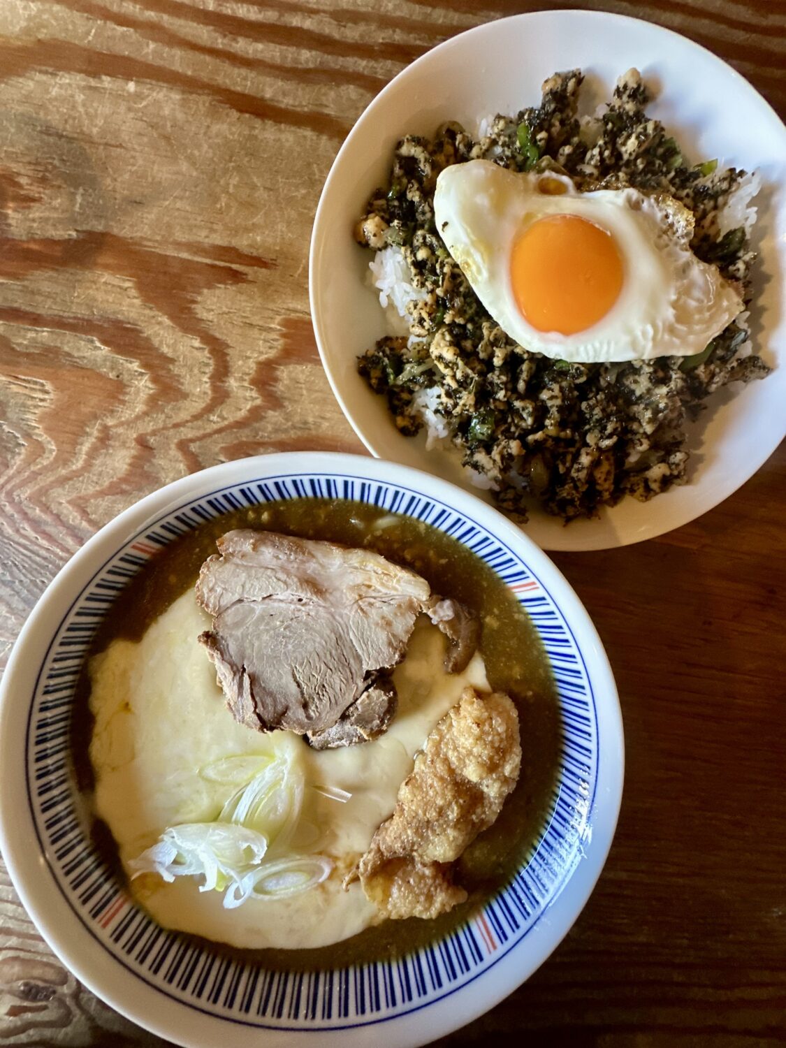 エスニックなスパイスガマリに色鮮やかな目玉焼き、これはきっとあとで一口でも二口でも食べてって料理が言ってるなぁしゃーないなぁ(^q^)
