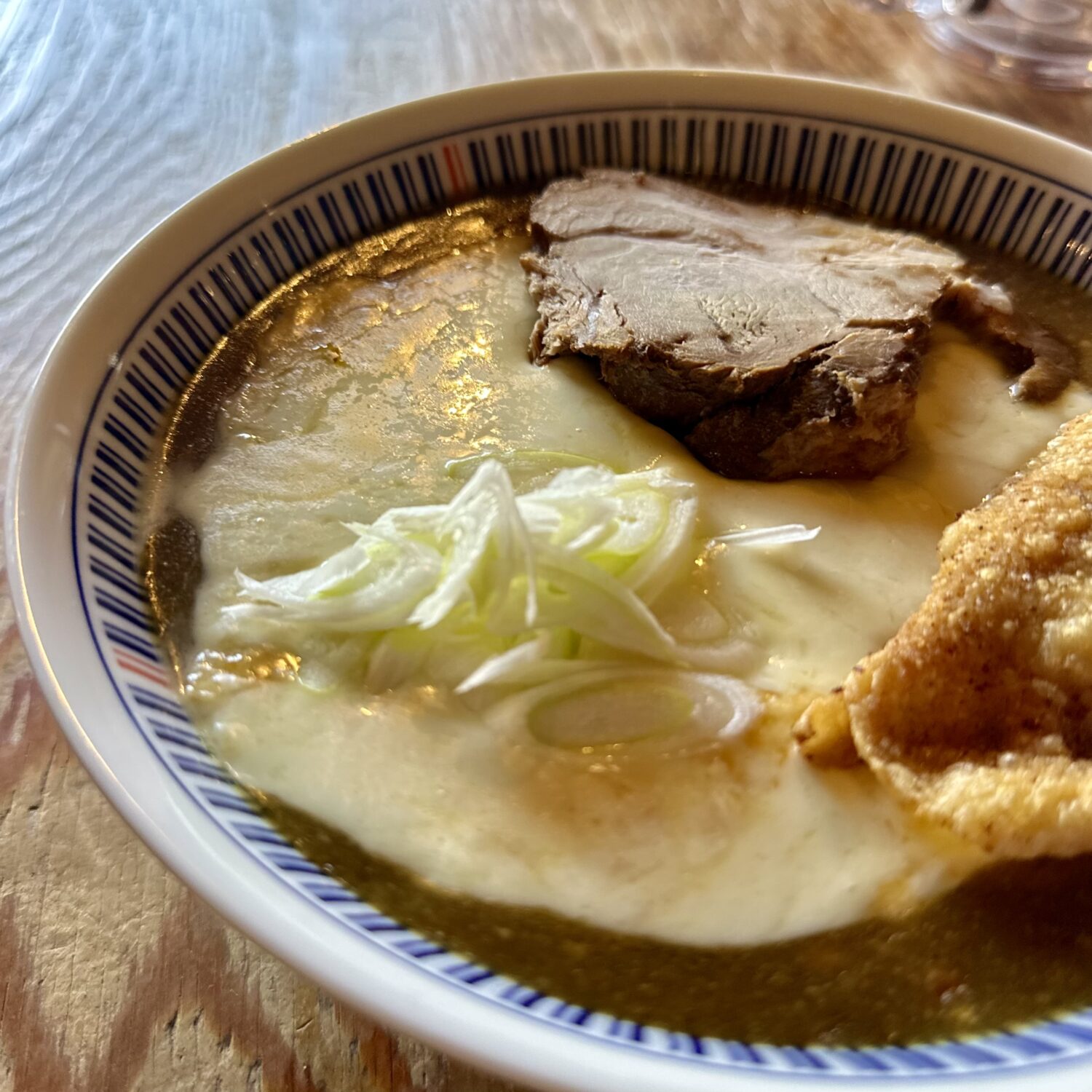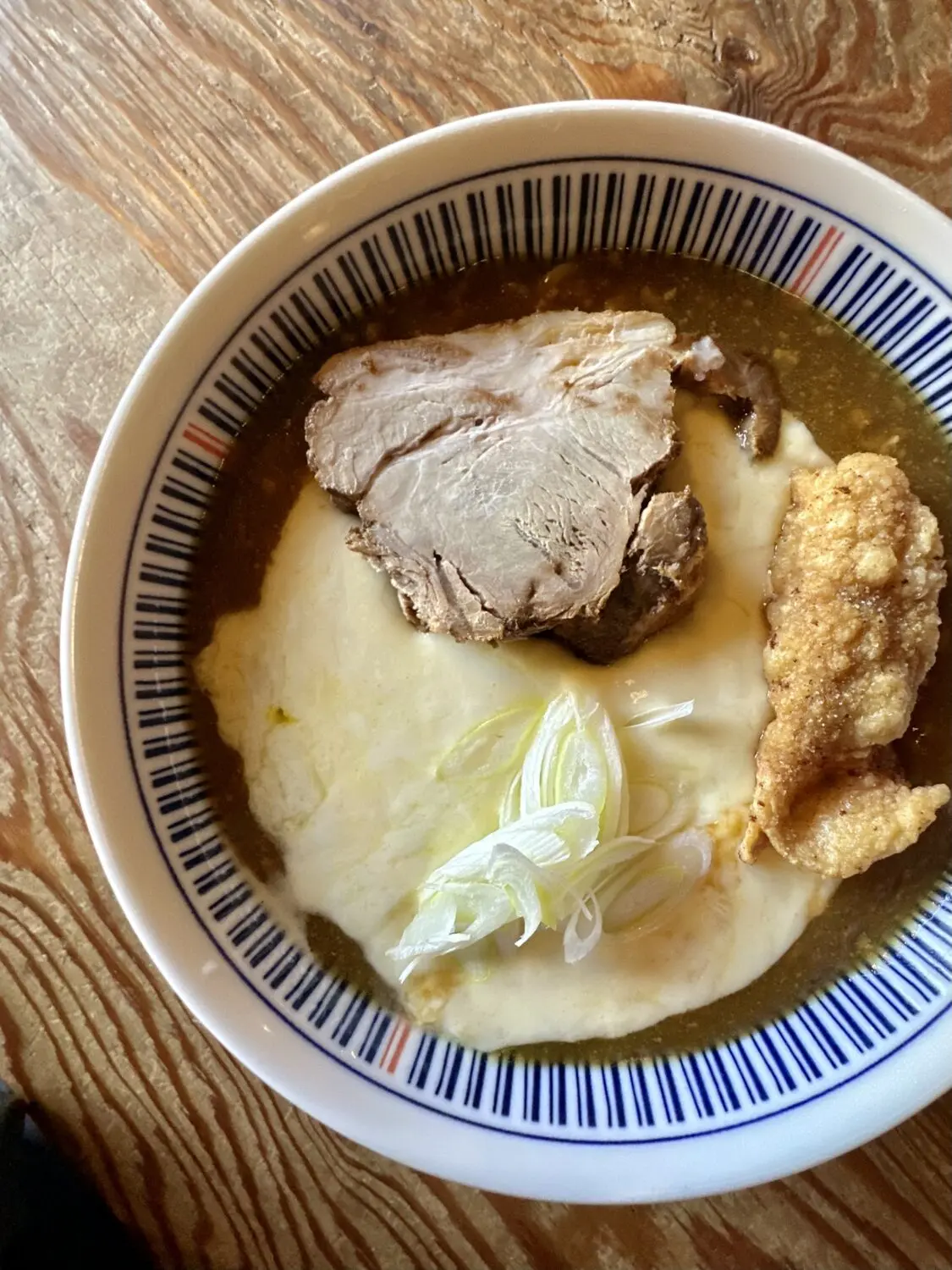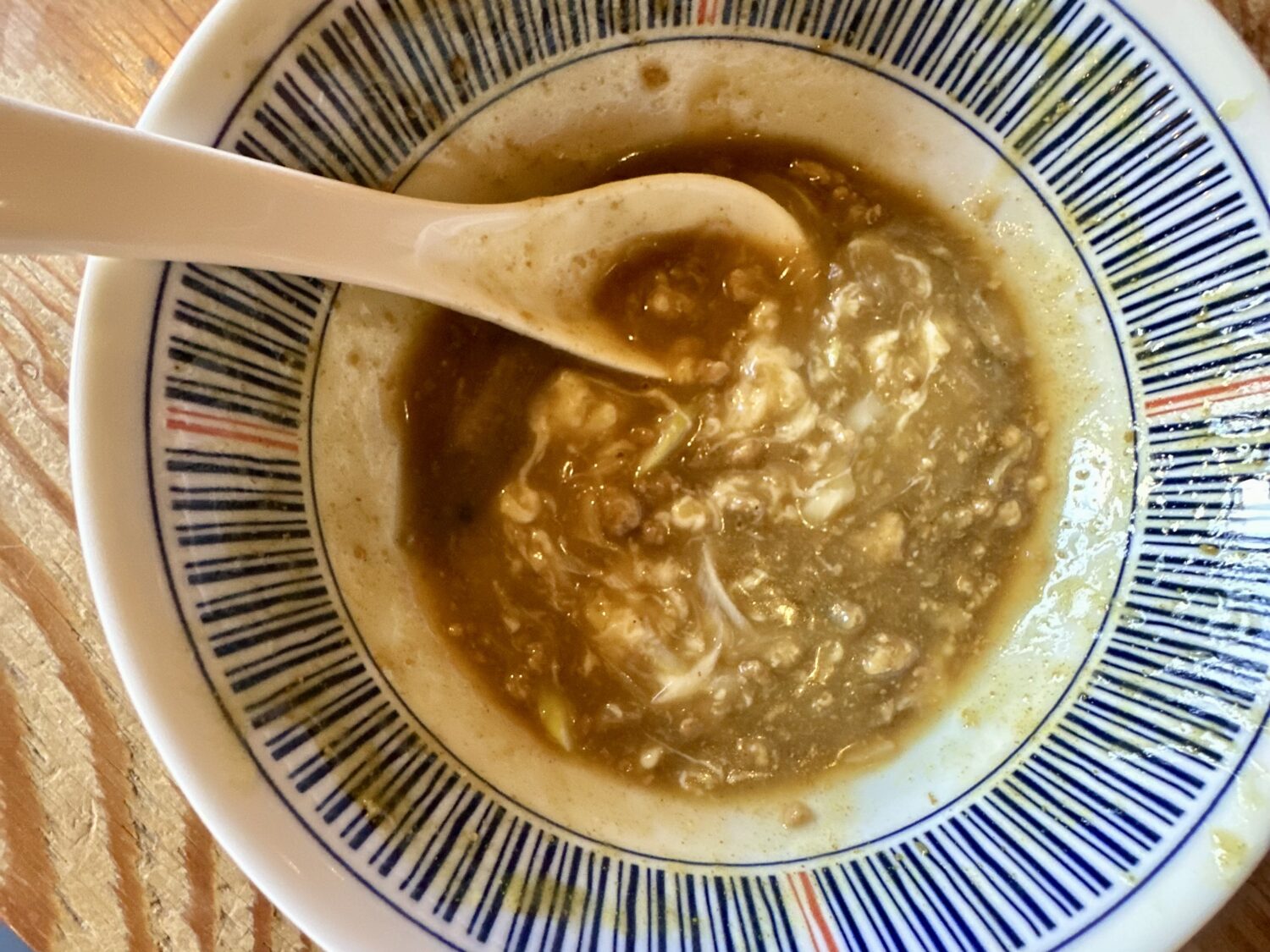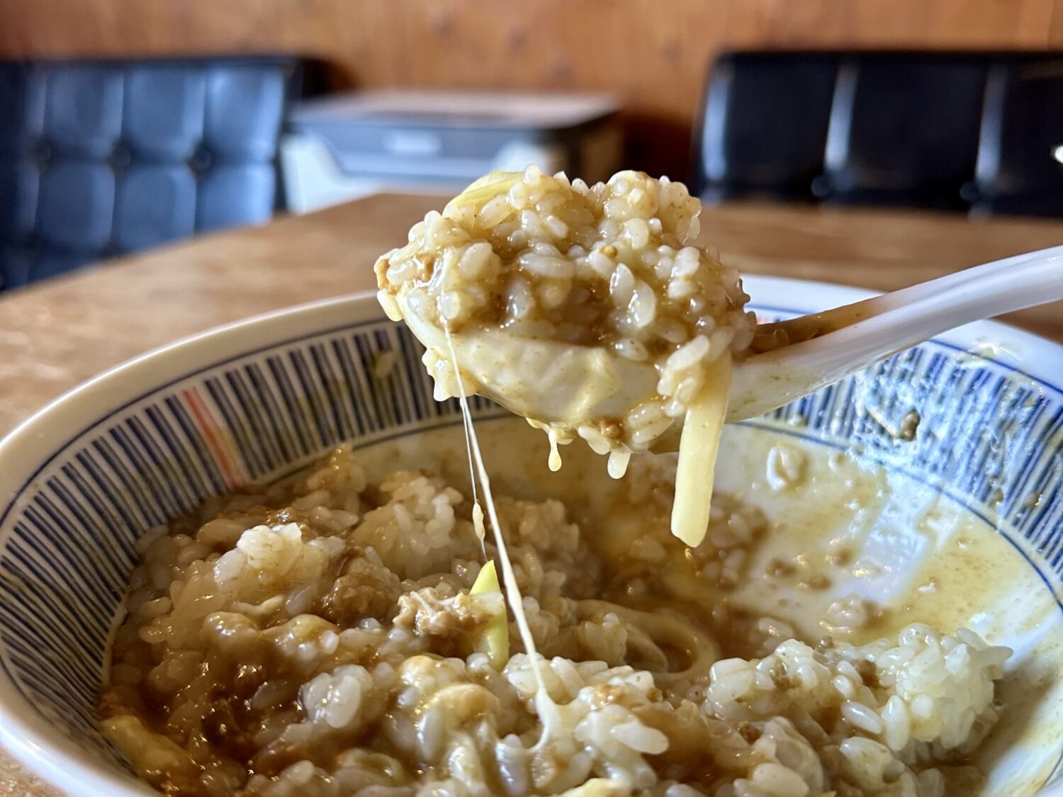 差したレンゲにまとわりつくほどのドロッドロの超高粘度、しかも専用トッピング「山盛りチーズ」によるドロドロマシマシ状態で、飲めば飲むほど強くなる、ような気がする旨さ。