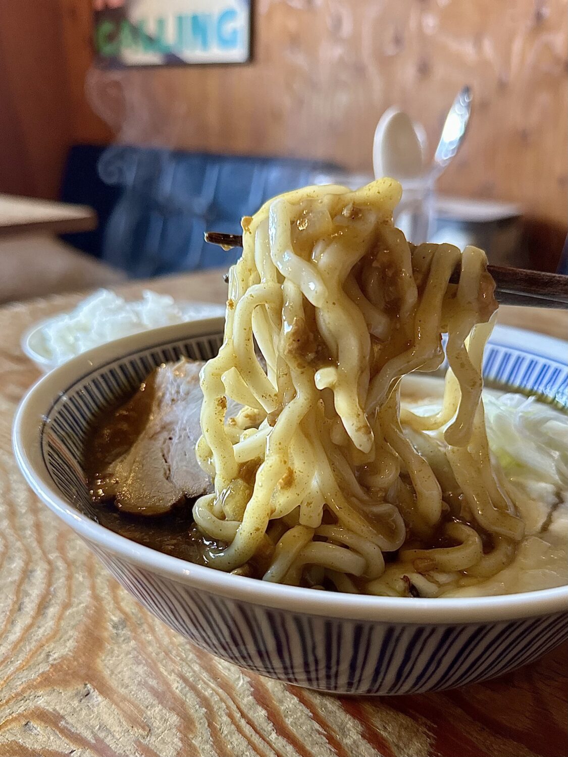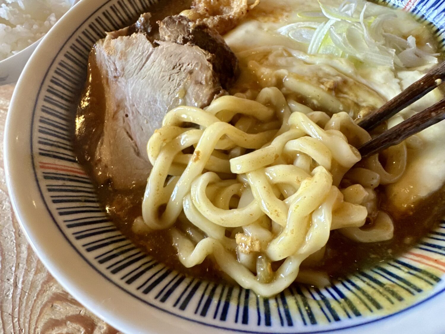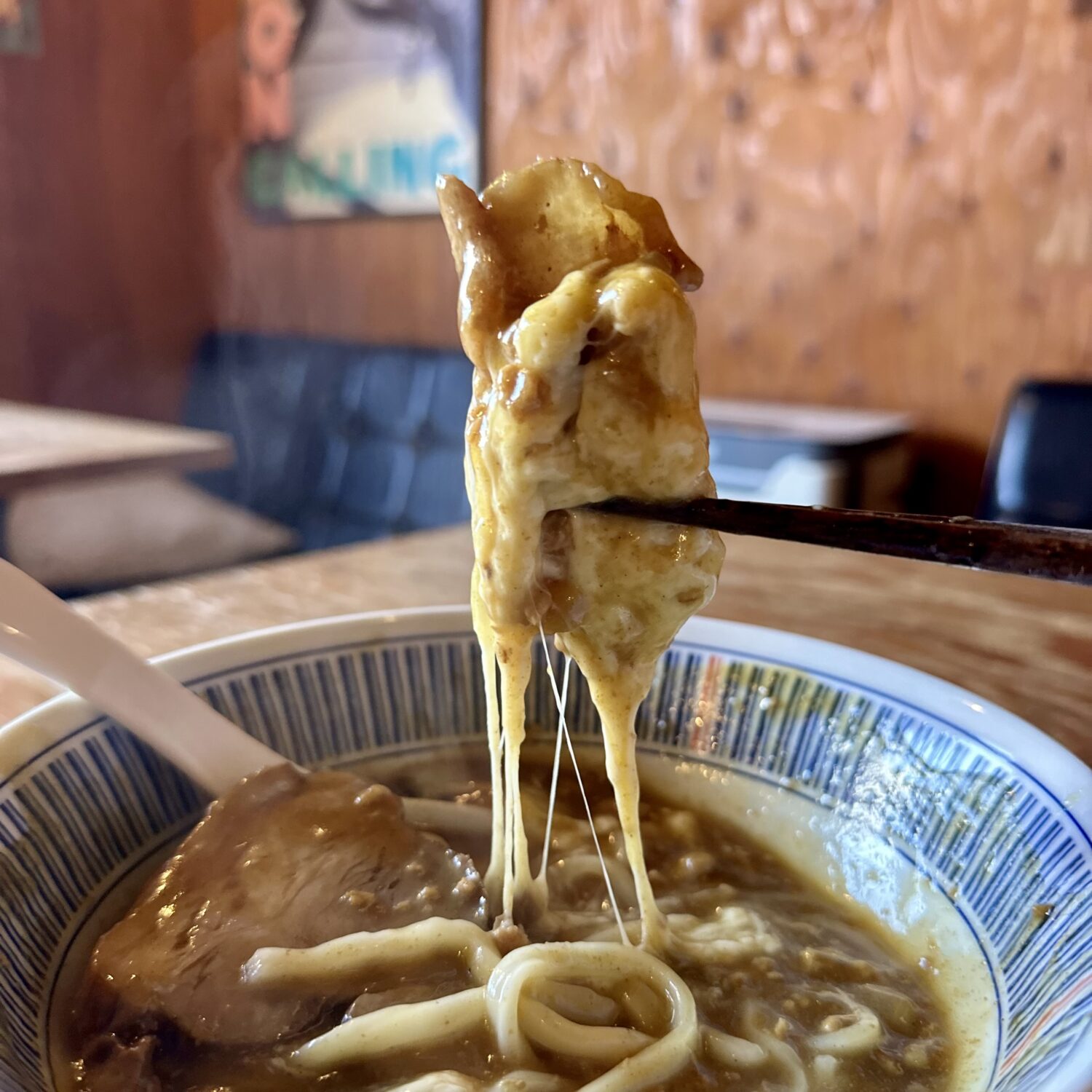 ムッチムチの歯触りのドゥルンドゥルンのタフな喉越し、まとわりついたカレー出汁とゴックンすればアヂッ、アヂヂヂヂッって焦るやづ。